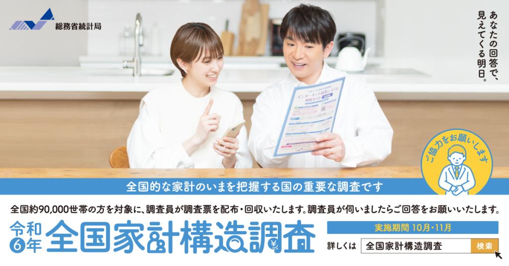 総務省統計局では、都道府県や市区町村を通じて、「令和6年全国家計構造調査」を実施します。調査へのご理解とご協力をお願いいたします。