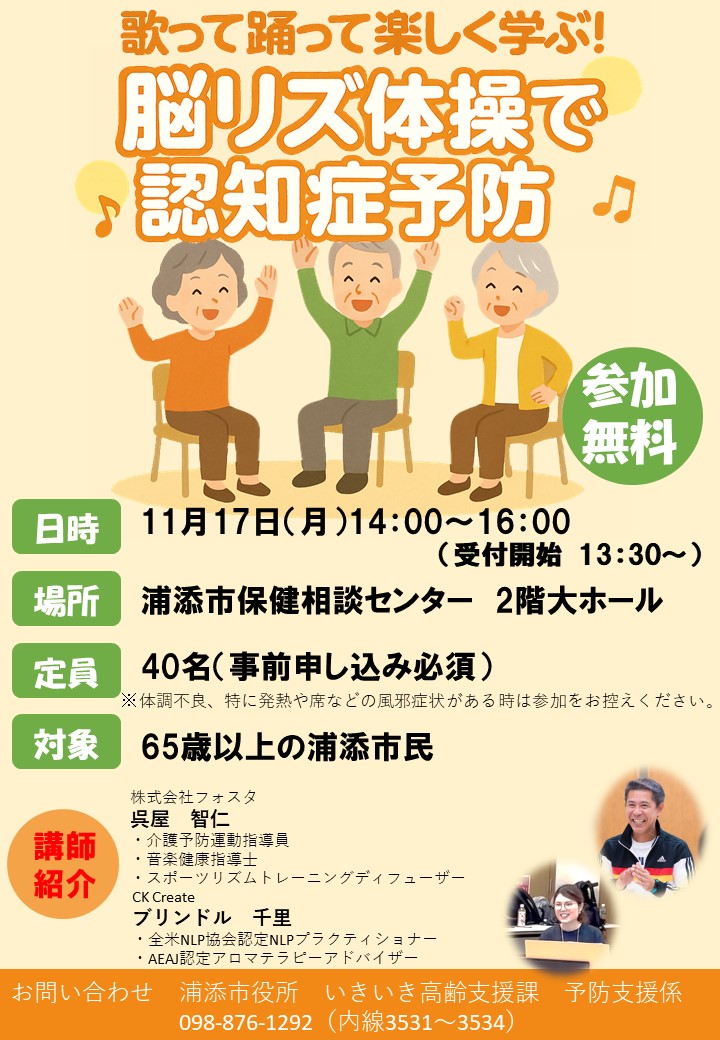 記事番号: 1-12616 公開日 2025年10月08日 更新日 2025年10月10日 ~脳リズ体操で認知症予防~ 浦添市では、講話と体操を通して楽しく認知症予防を学ぶ介護予防講話を開催します。 音楽に合わせて体を動かし、脳をリズミカルに刺激しながら心も体もリフレッシュ! 講話では日常生活でできる認知症予防のヒントをわかりやすく紹介します。みんなで笑顔になれる時間を一緒に過ごしましょう。