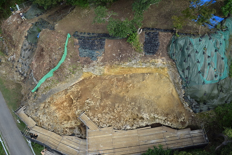 この石灰岩礫は城壁の裏込に用いられたものとみられることから、発見された城壁は元々はさらに高くまで積まれており、崩落したことで城壁の下部が埋まったのだろうと考えられます。