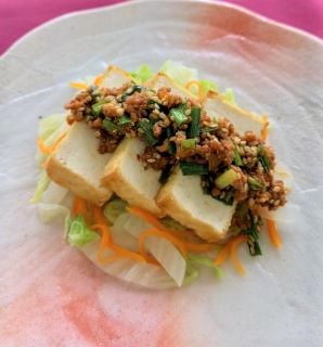 ⑤ ②で焼いた豆腐の上に、④のそぼろをのせ盛り付けたら完成!