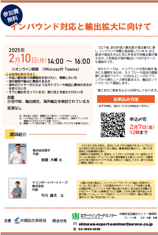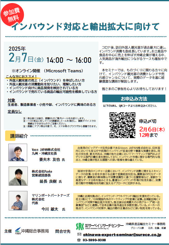 この度、本事業を通して収集した情報を沖縄県内企業の皆さまに広く共有し、インバウンド対策や輸出の拡大に取り組むためのセミナーが開催されますのでご案内いたします。