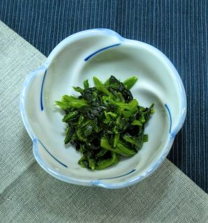 - 耐熱容器に冷凍ほうれん草を入れ、600Wの電子レンジで3分加熱し、水気をしぼる。