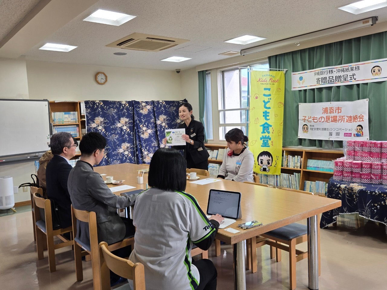 浦添市こども未来部長 仲本 力(なかもと つとむ)(写真左から3番目)より「今年度2回目の寄贈ありがとうございました。子どもの貧困対策のために、そのまま捨てればごみ、しかし、リサイクルをすることでシュレッダーmのされた紙も資源となる。子どもたちにとっても、SDG,sの流れとして良い支援となっており、この流れを理解することも、子どもたちにとっても良い体験となっております。」と挨拶がありました。