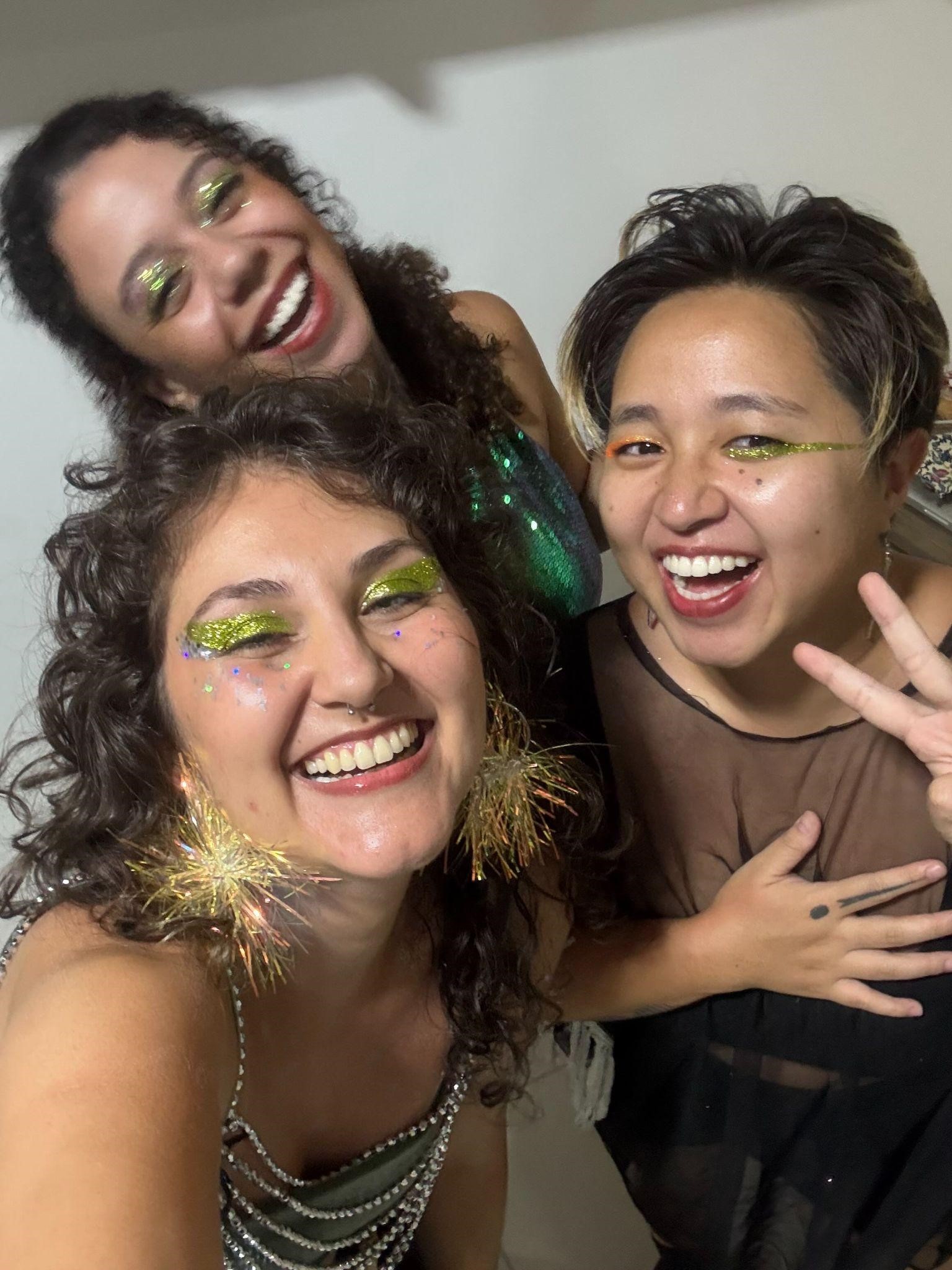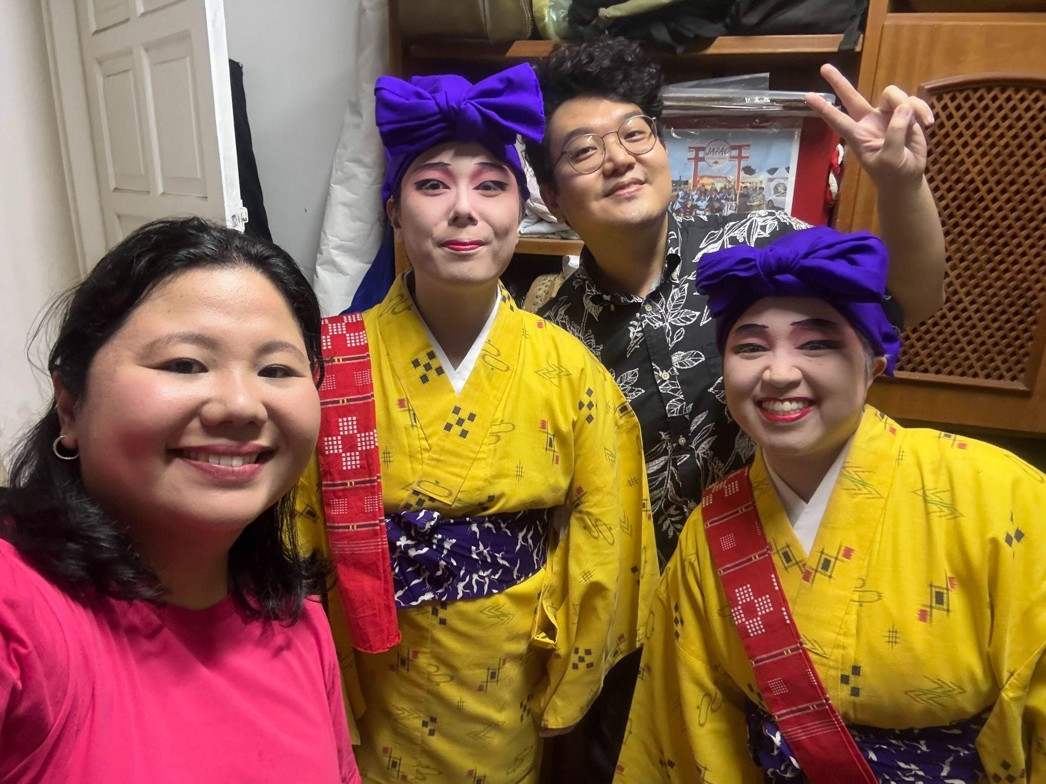 新年会当日、私たちは早めに到着し、舞踊の演技の準備と支度を手伝いました。ルーカスさんは私たちのメイクをしてくださり、美しく着飾ってくださいました。ジェシカさんと私は、舞台上で少しリハーサルをし、最終的なディテールを微調整しました。正直なところ、舞踊はいつも一番緊張するパートなのですが、ジェシカさんが一緒だったのでリラックスすることができました。午後5時、私たちは加那ヨーを踊りました。緊張しましたが、いい仕事ができたと思います。ジェシカさん、ルーカスさん、本当にありがとうございました。すべての過程がとても楽しかったです。