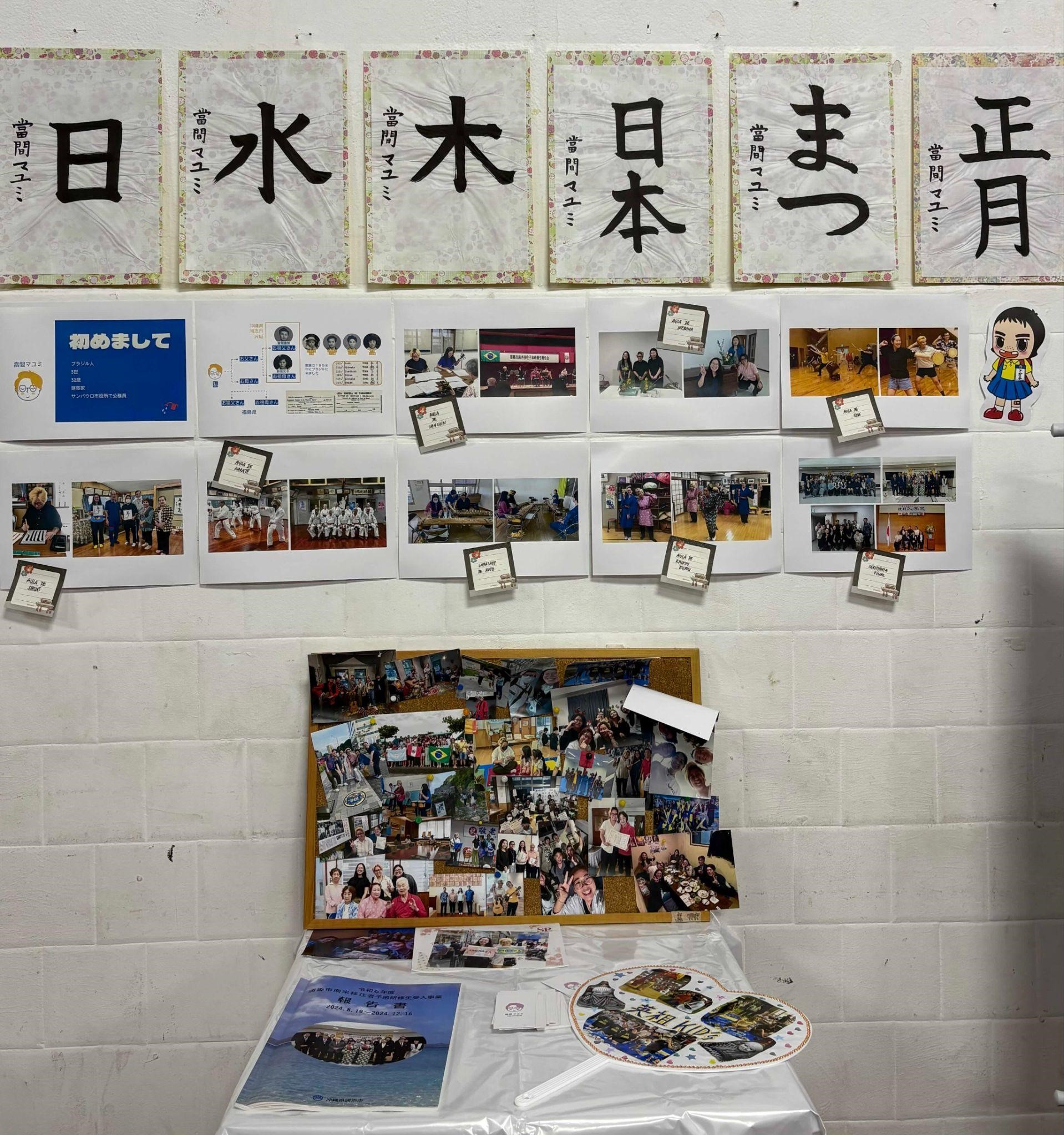 月末の23日、ブラジル浦添郷友会主催の「浦添新年会」が開催されました。私たちは1月からこのパーティーを計画していました。各パートの責任者を決めるミーティングも行いました。私は自分の書道を展示し、研修での経験を少しでも皆さんに知ってもらおうと思い、フォトウォールを作りました。写真を見ていたら、強い懐かしさを感じました。