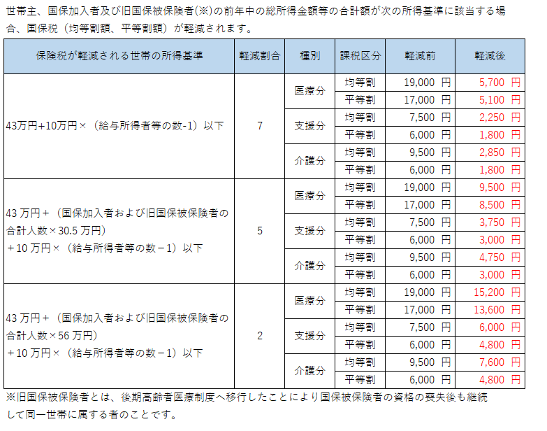 ※あくまで一例です。世帯合計所得や加入者数によって、軽減が適用されない場合や、税額が異なる場合があります。詳しくは以下の表をご参照ください。
