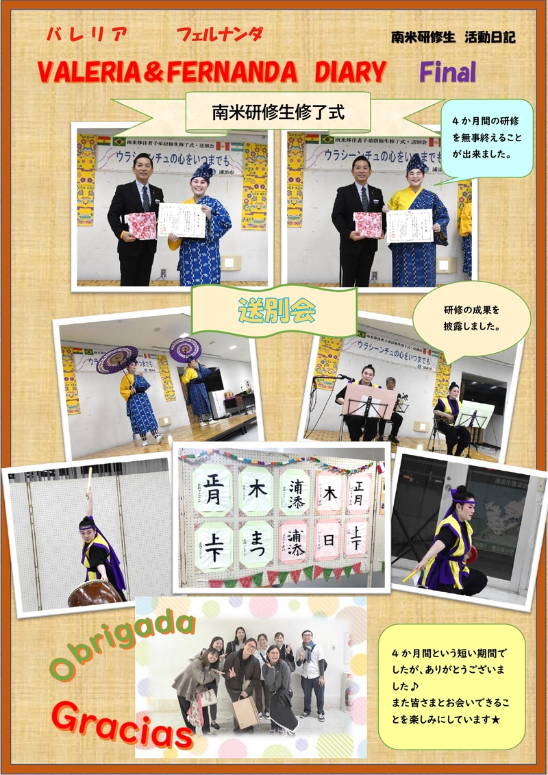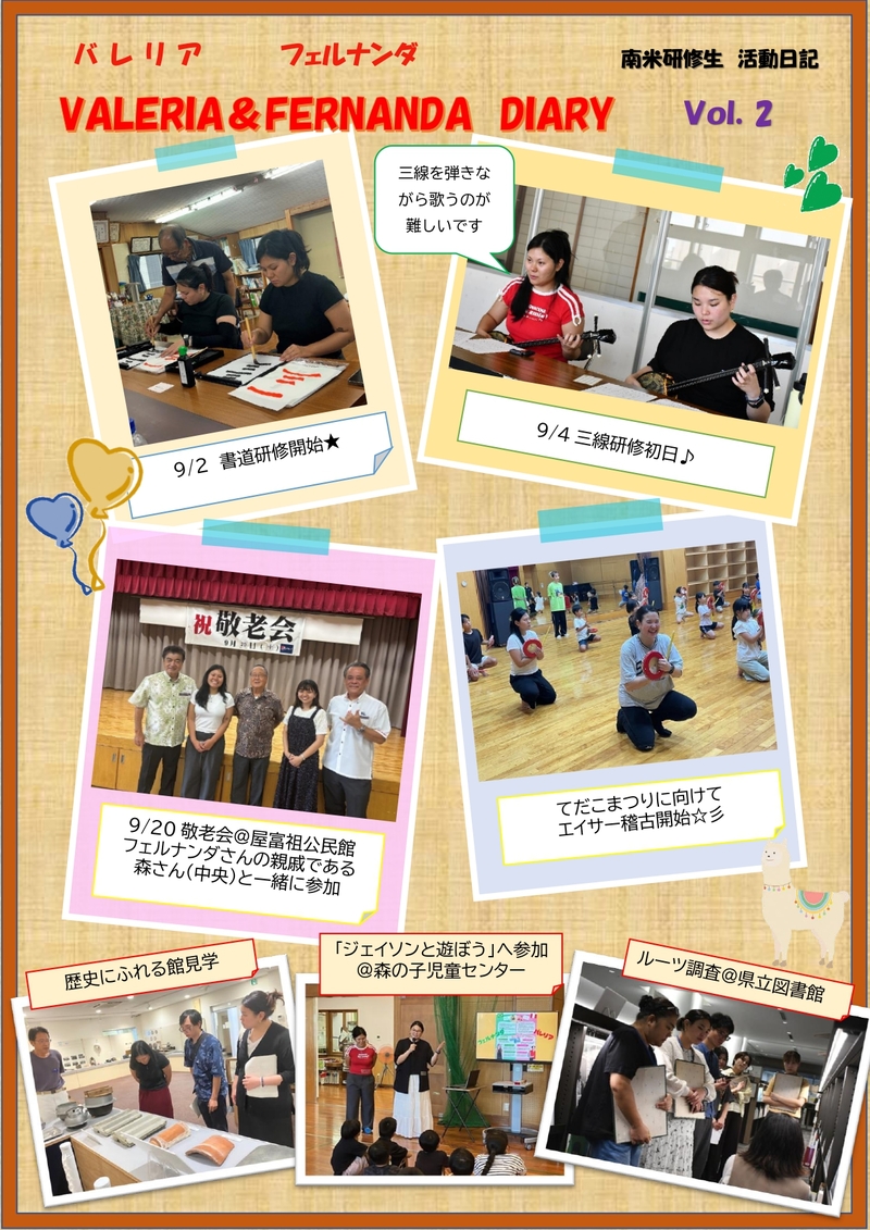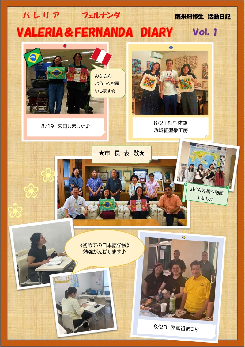 今年度は、ブラジルから勢理客 宮城(しりかく みやしろ)フェルナンダさん、ペルーから若林 稲福(わかばやし いなふく)バレリアさんが研修生として8月19日に来日し、4か月間浦添市で研修を受けます。2人は日本語、三線、書道、琉舞など沖縄や日本の文化を学び、沖縄と南米の懸け橋になる事が期待されます。