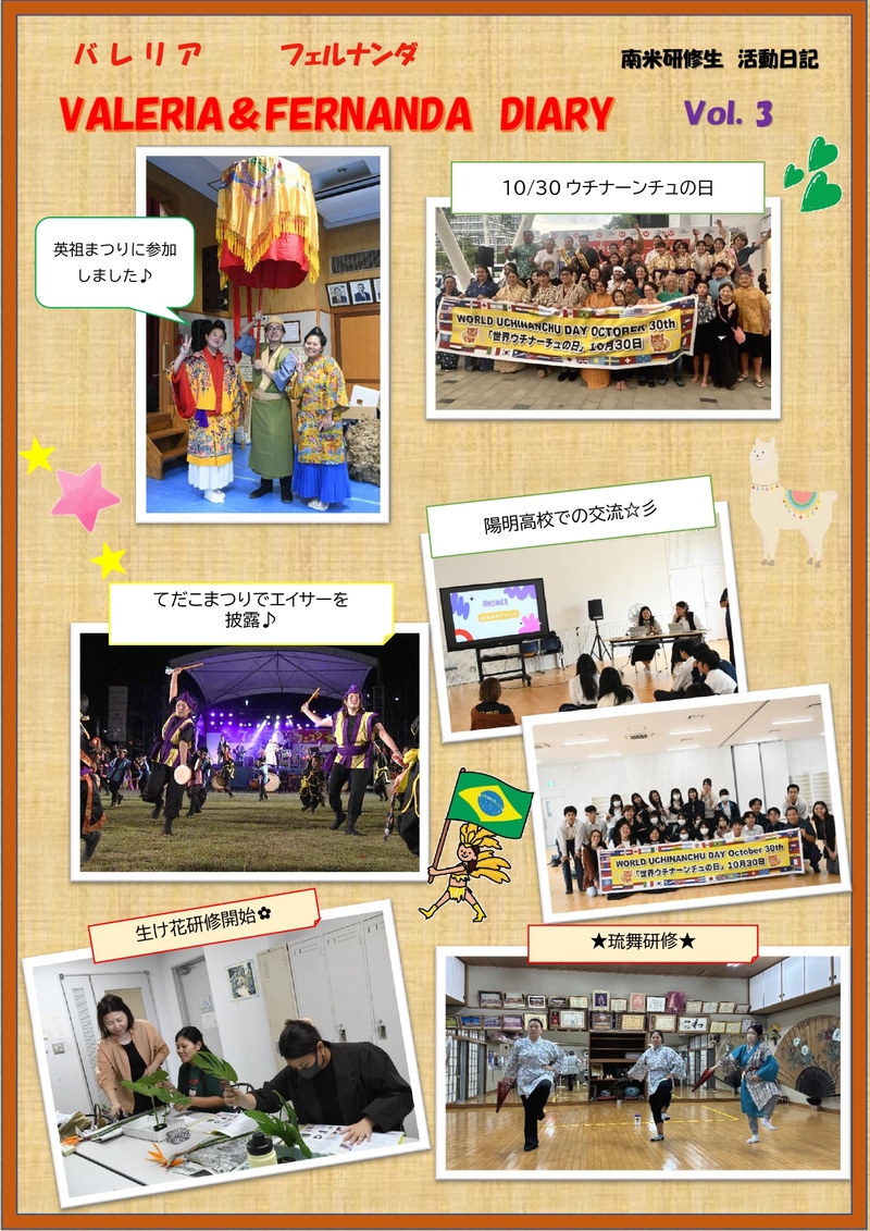 私のおじいちゃんは屋富祖で生まれて、戦争の後ブラジルに移民しました。私のおじさんは、ブラジルで沖縄そばの店をしています。だから、私はよく食べに行きます。それから、子どもの時、おばあちゃんがサーターアンダギーやウンブサーを作ってくれました。研修で三線や琉球舞踊を学ぶのがとても楽しみです。また、日本語も上手になりたいです。一生懸命頑張ってたくさんのことを習得します。