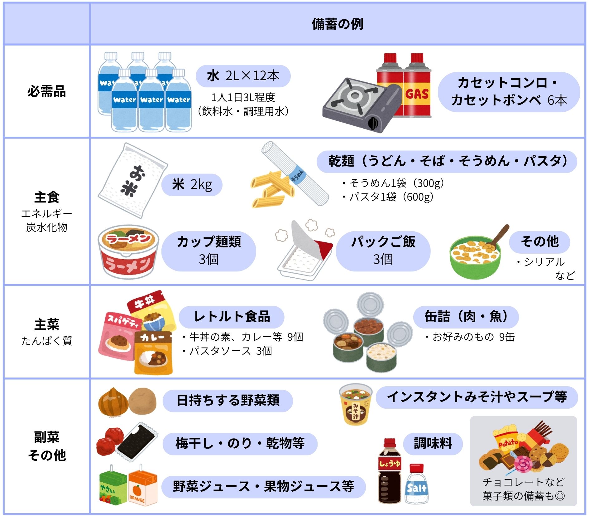 備蓄の目安 = 最低3日分~できれば1週間分 × 人数分