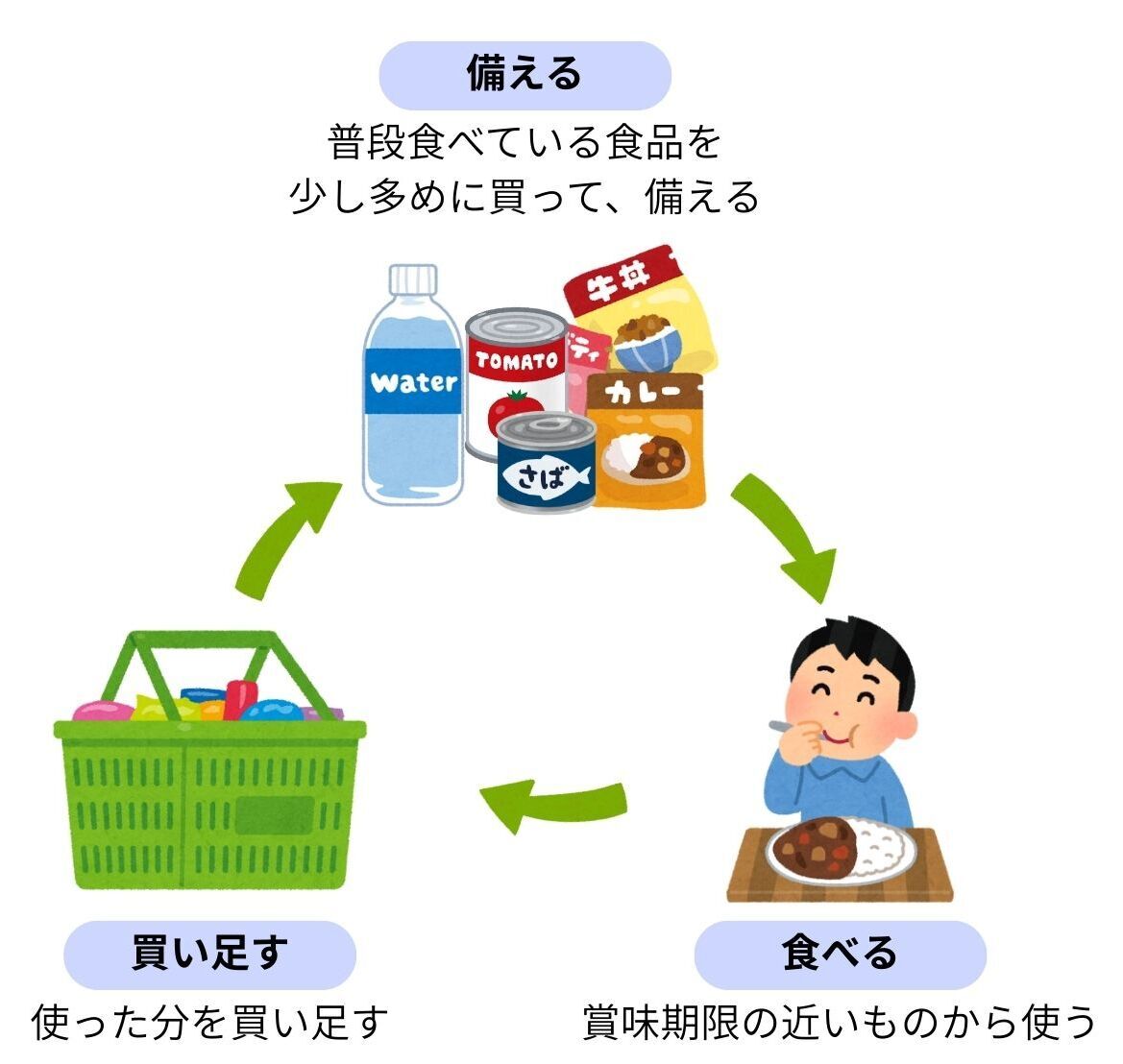 「ローリングストック」とは、普段から食べている食品を少し多めに買っておき、賞味期限の近いものから消費して、食べた分を買い足す方法です。こうすることで、常に一定の食品を家庭で備蓄することができます。日常の買い物の範囲でできるので、食品備蓄の第一歩におすすめです。