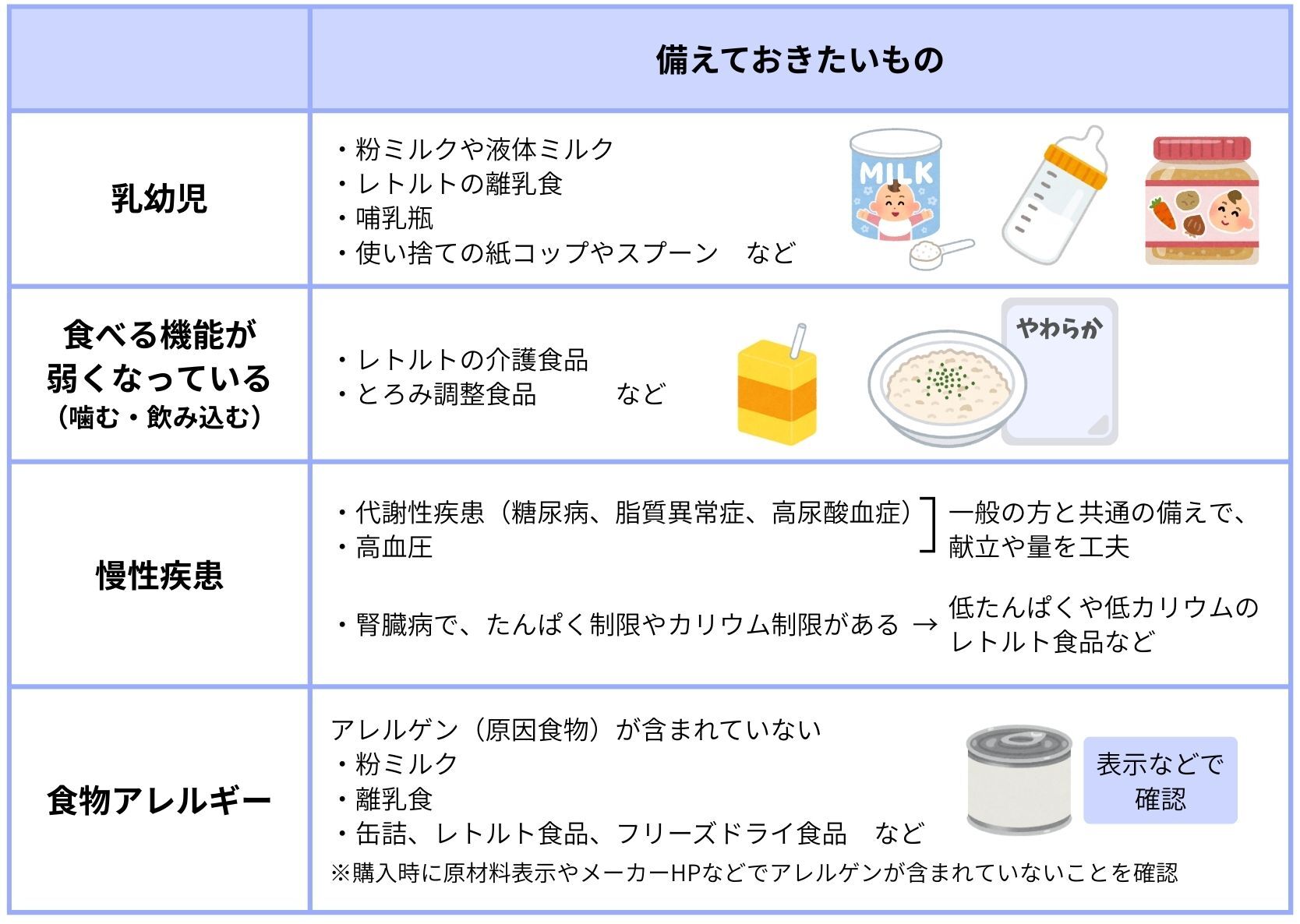 乳幼児、食べる機能(噛むこと、飲み込むこと)が弱くなっている、慢性疾患(腎臓病のたんぱく制限やカリウム制限など)がある、食物アレルギーがあるなど、食事に特別な配慮が必要な方は、災害時に避難所で配られる食事が食べられない場合があります。