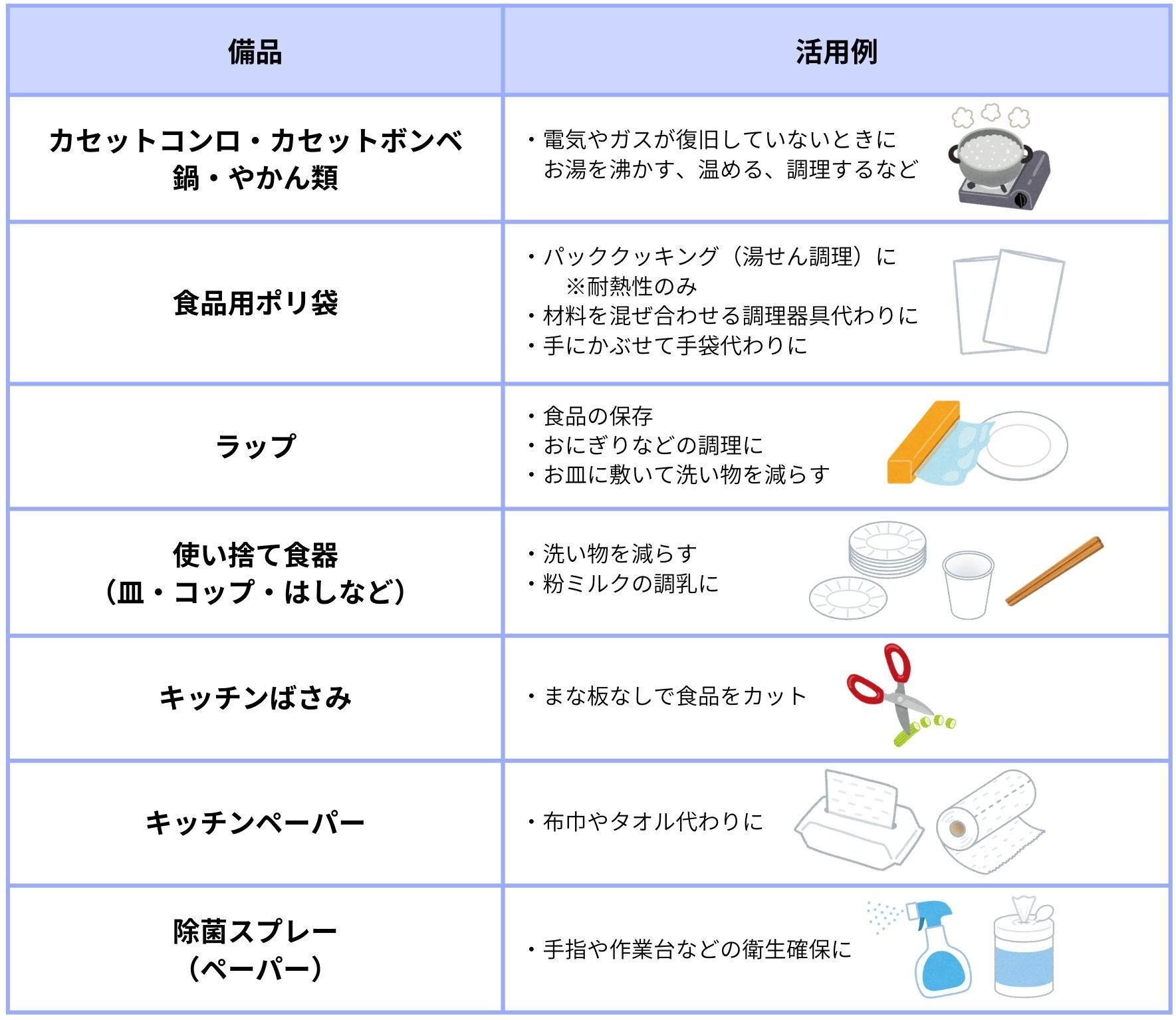 食品と同じく大切なのが、食事の用意をするときに使う備品類。身近な家庭用品が、災害時にも活躍してくれます。