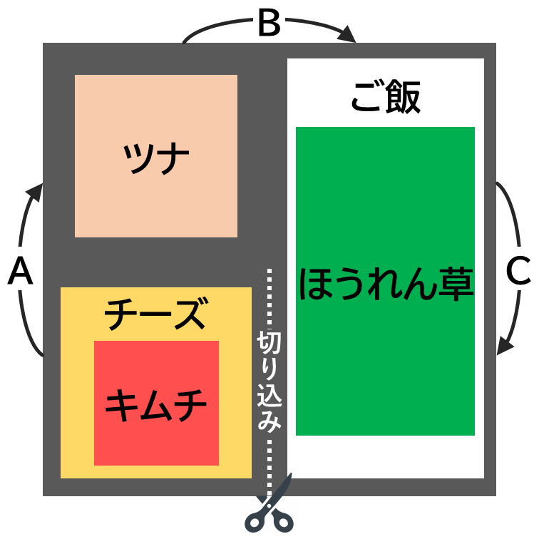 - 左下からA→B→Cの順に折りたたみ、ラップで包んだら完成!