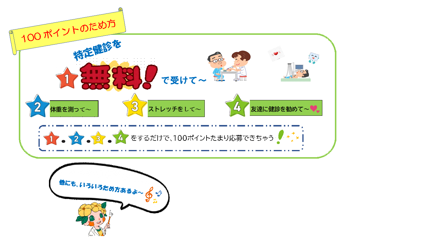 健康づくりを支援する事業です。特定健診やがん検診を受診したり、保健指導を受ける 健康づくりの取り組みを行う等でポイントがもらえます。