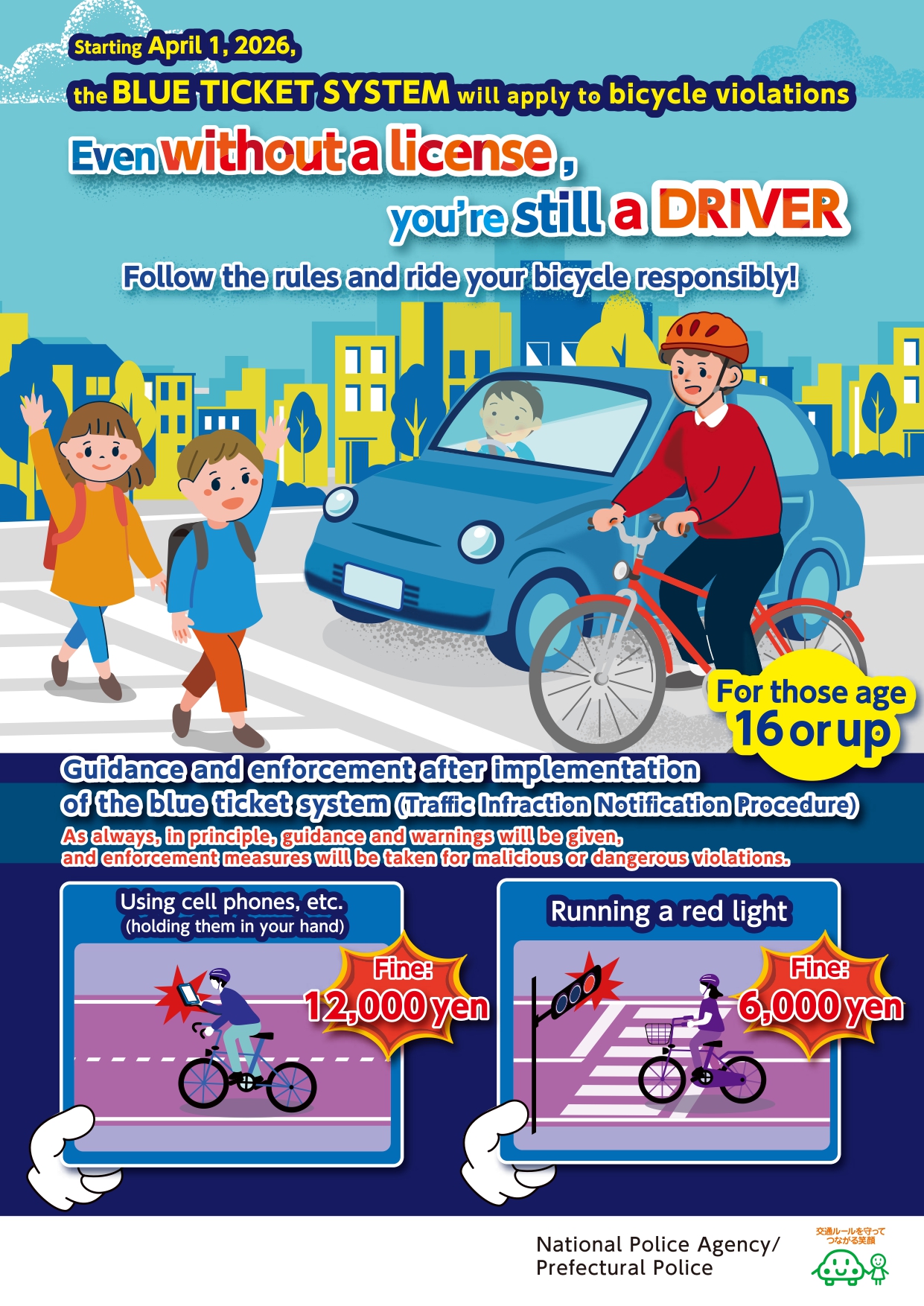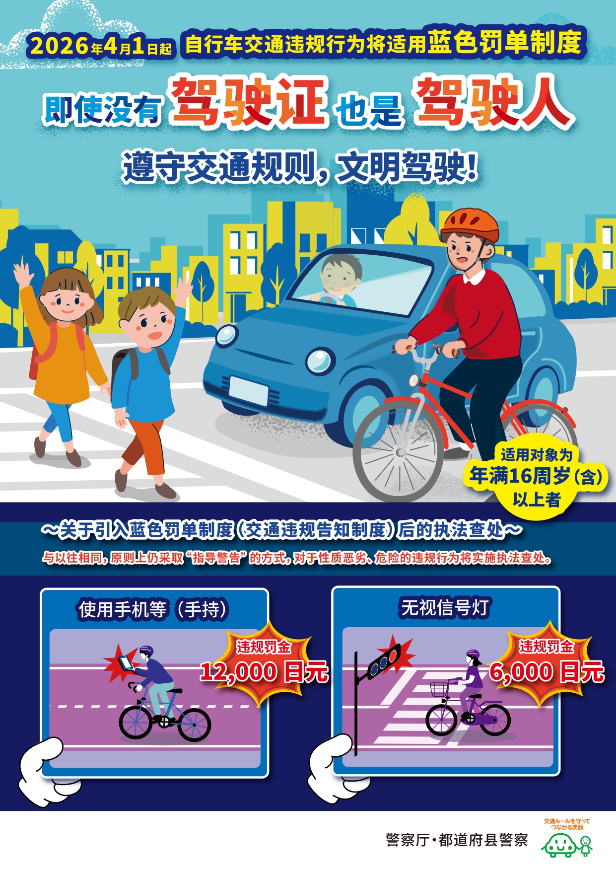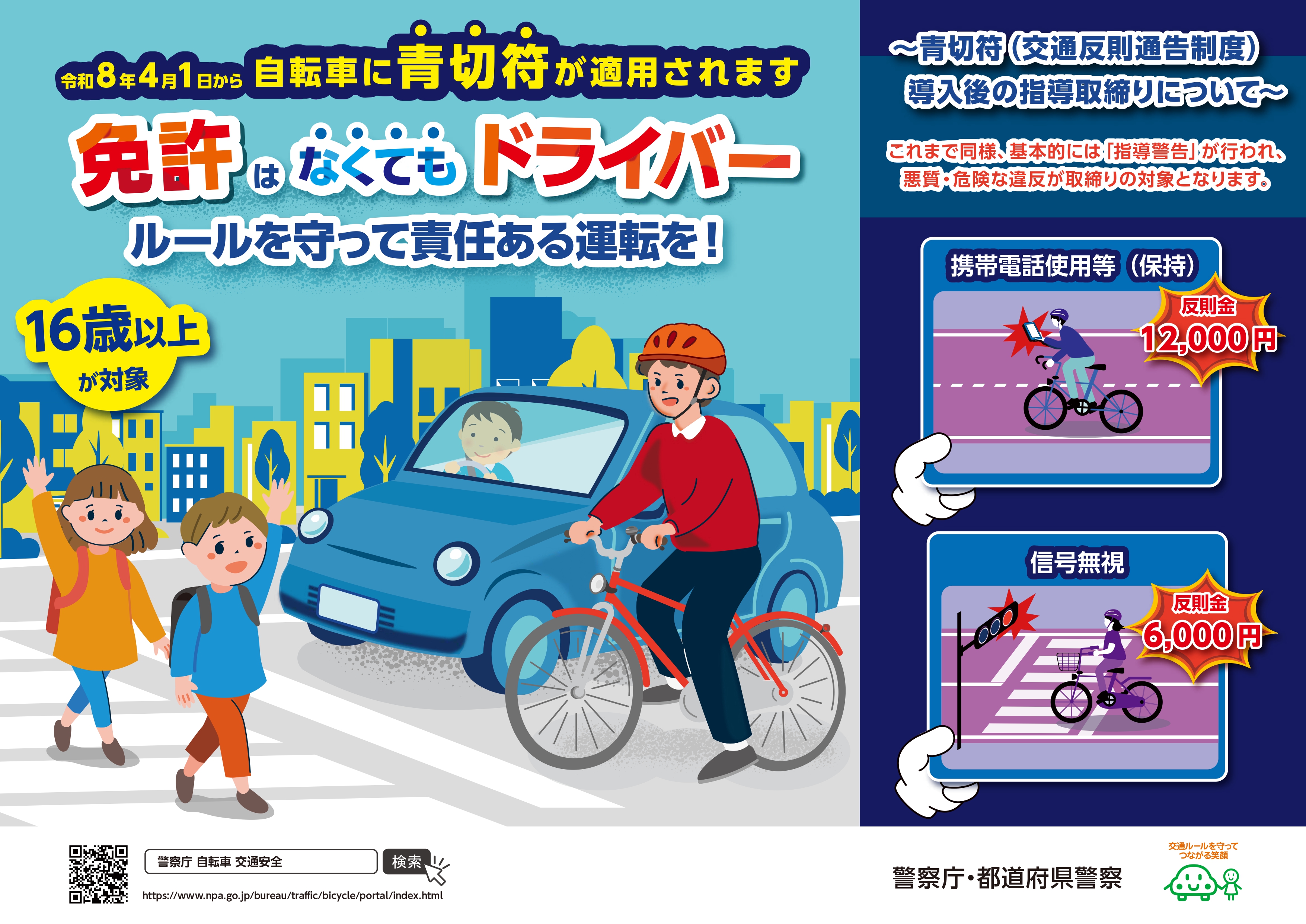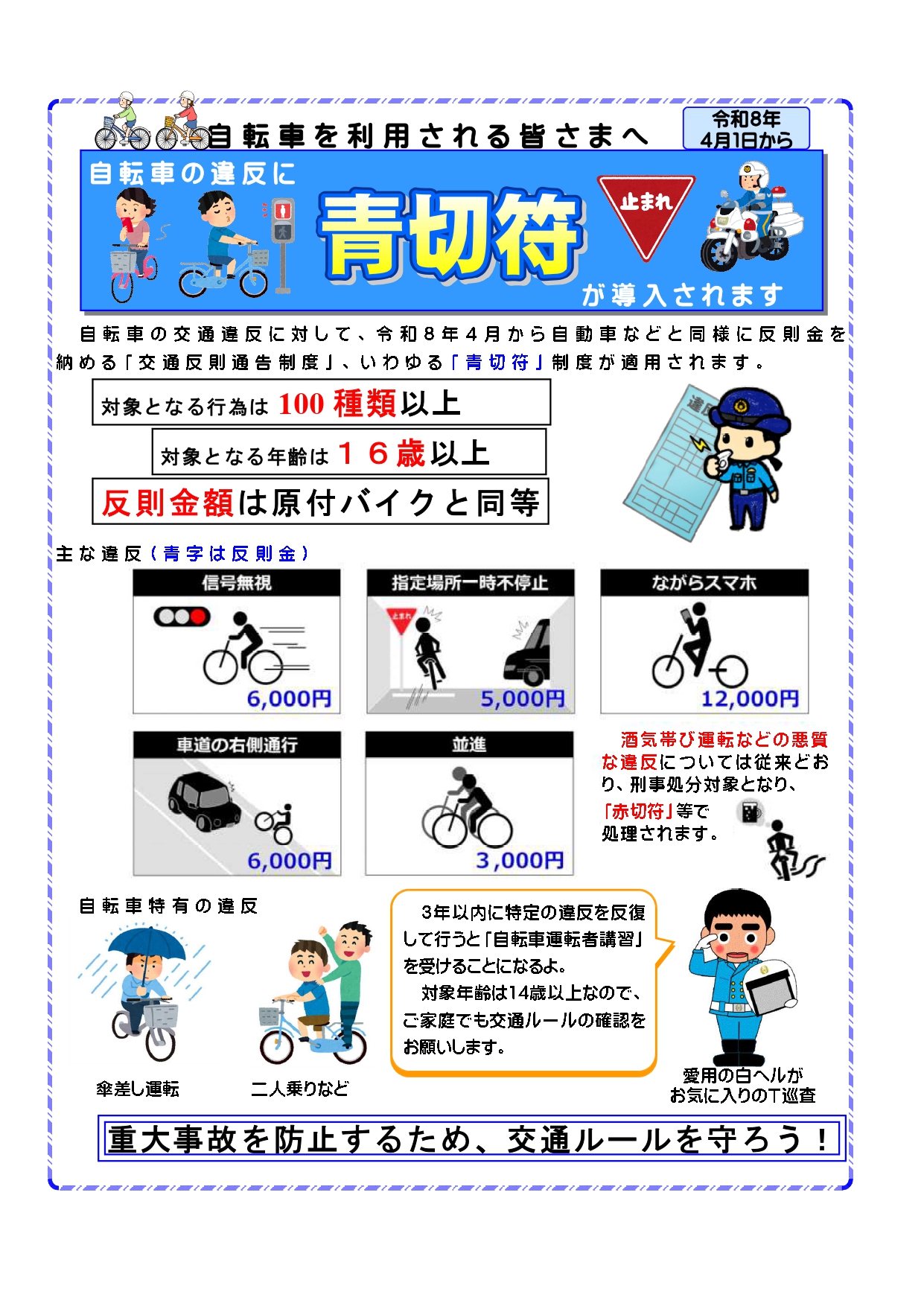 自転車の交通違反に対して、令和8年4月1日から自動車などと同様に反則金を収める「交通反則通告制度」いわゆる「青切符」制度が適用されます。