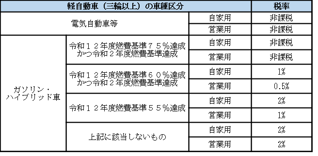 ※令和元年10月1日から令和3年12月31日までの間に取得した軽自動車(乗用自家用)については、環境性能割の税率が1%軽減されます。