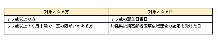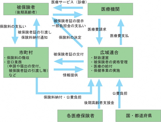 沖縄県後期高齢者医療広域連合が被保険者証の交付、保険料の決定、医療を受けたときの給付などを行い、市町村は、被保険者証の引き渡し、保険料の徴収、申請や届け出の受付などの窓口業務を行います。