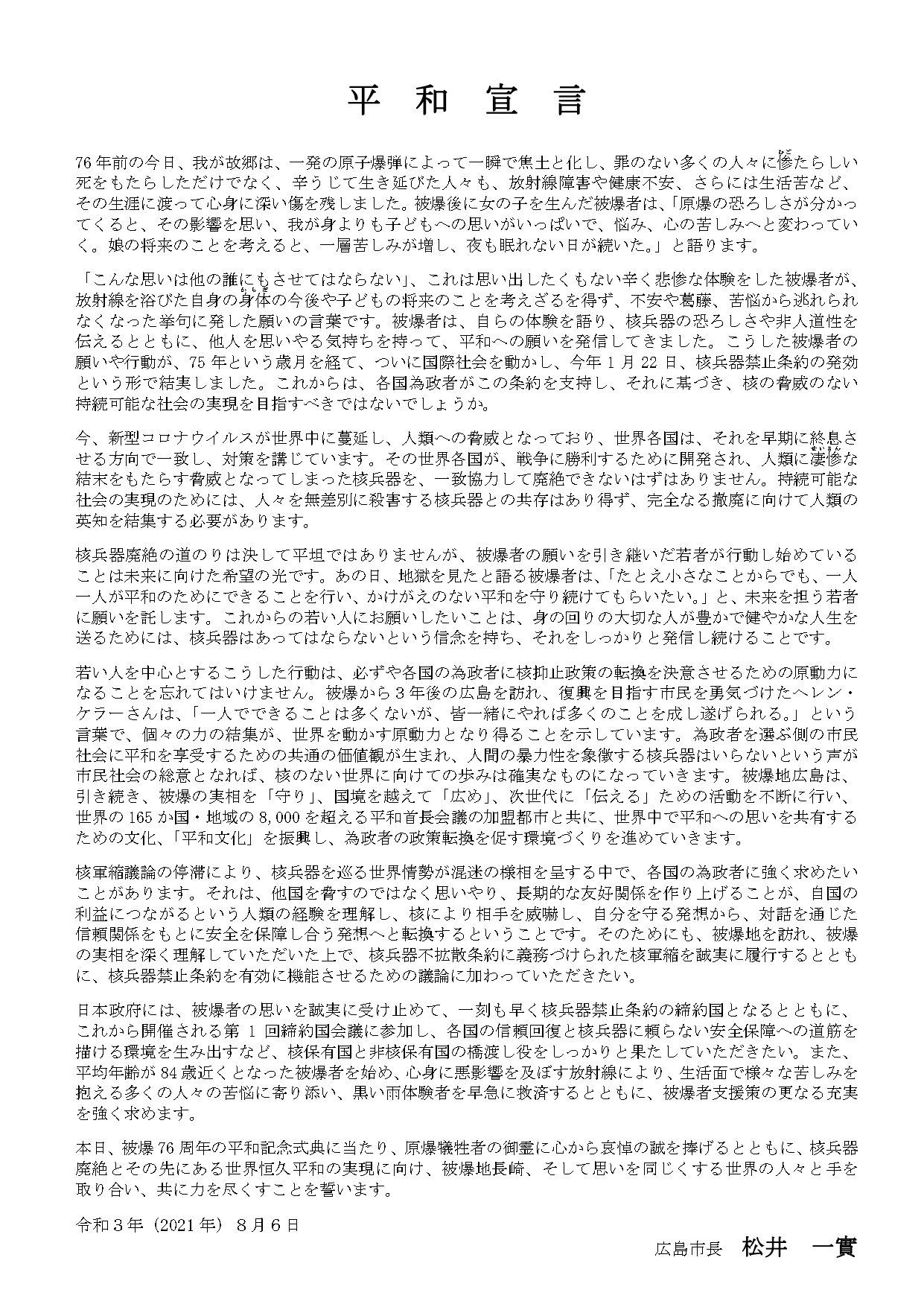 令和3年8月6日(金)、松井一實広島市長が今年の平和宣言を発表しました。
