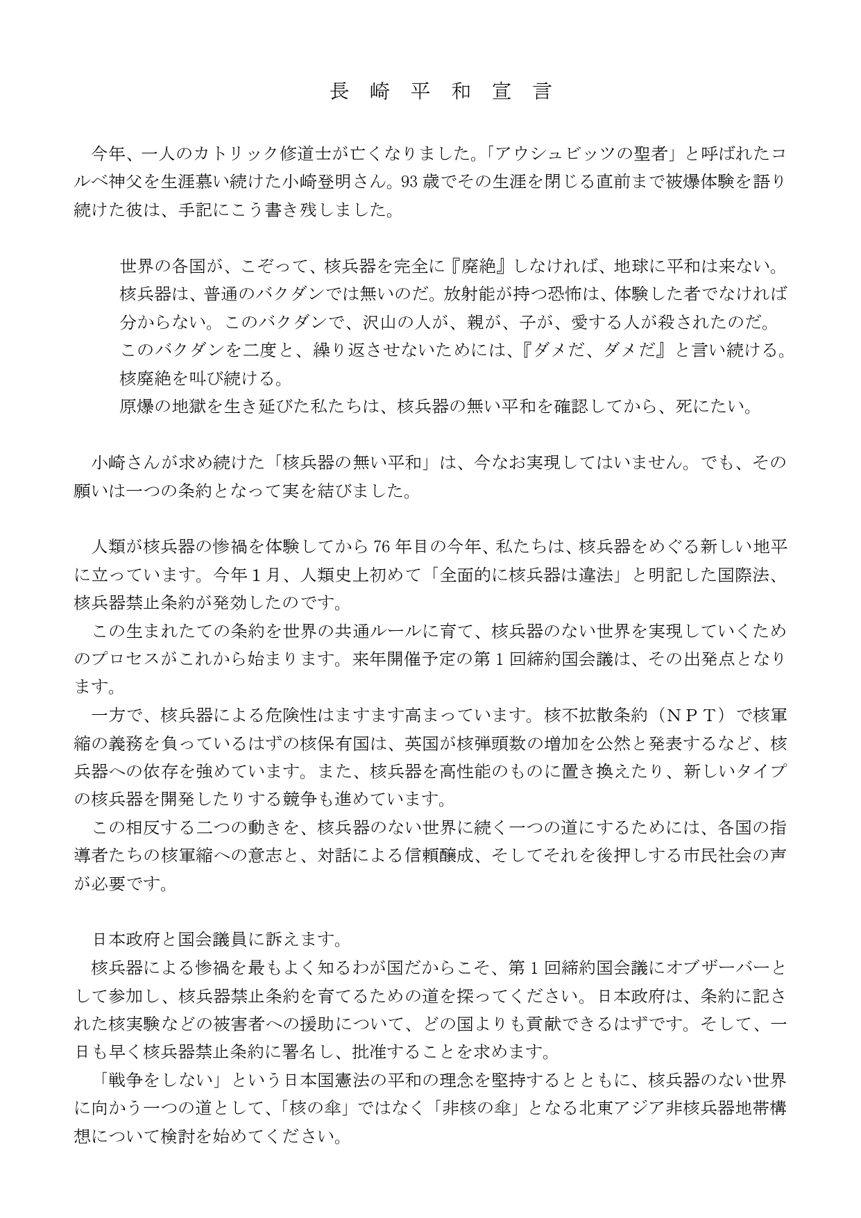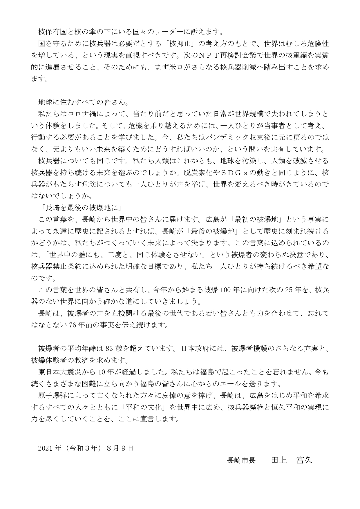 令和3年8月9日(月)、田上富久長崎市長が今年の平和宣言を発表しました。