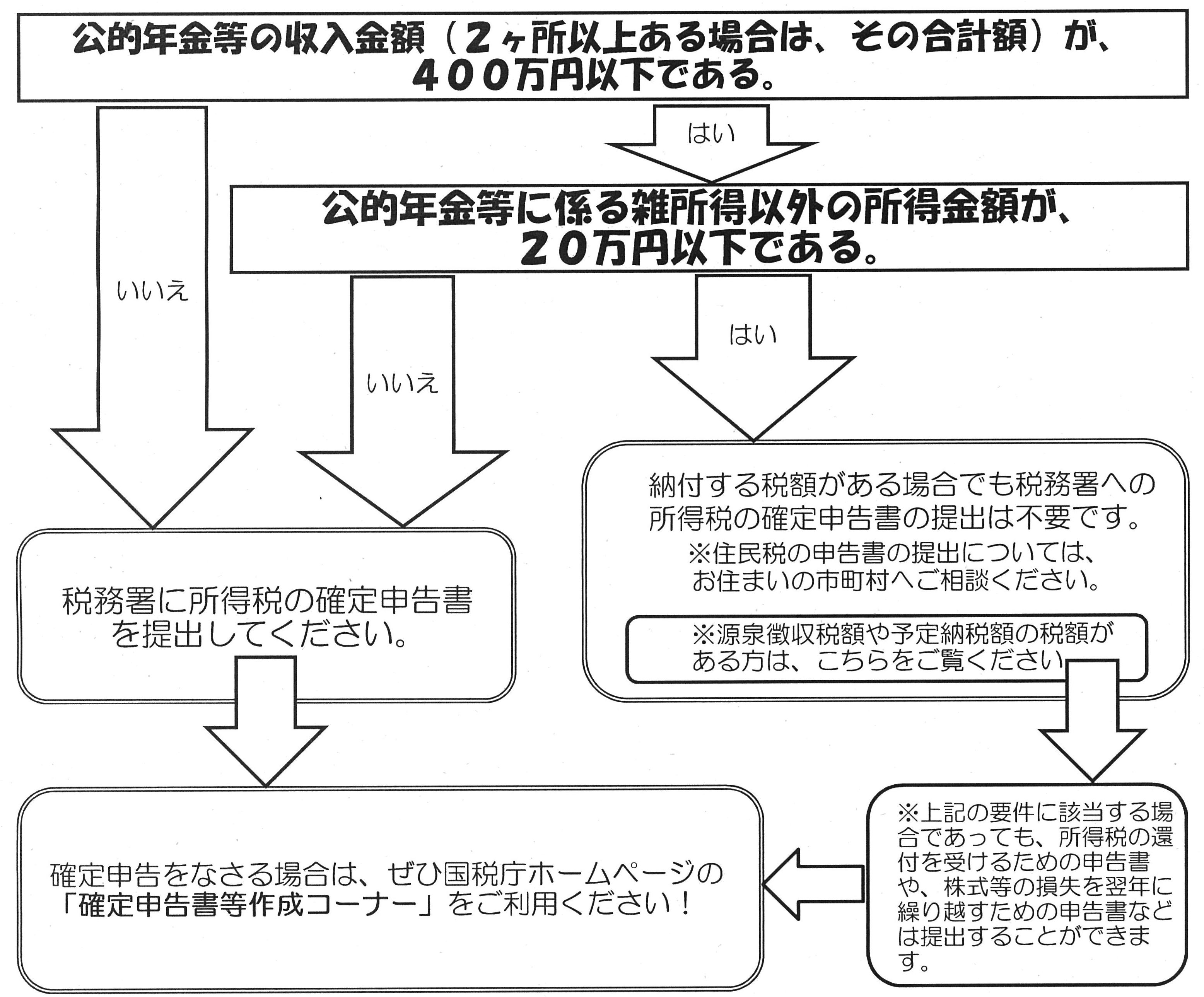 所得税法が改正され、平成23年分以後の所得税について、その年分の公的年金等の収入金額が400万円以下であり、かつ、その年分の公的年金等に係る雑所得以外の所得金額が20万円以下である場合には、所得税の確定申告書の提出が不要(注)となりました。