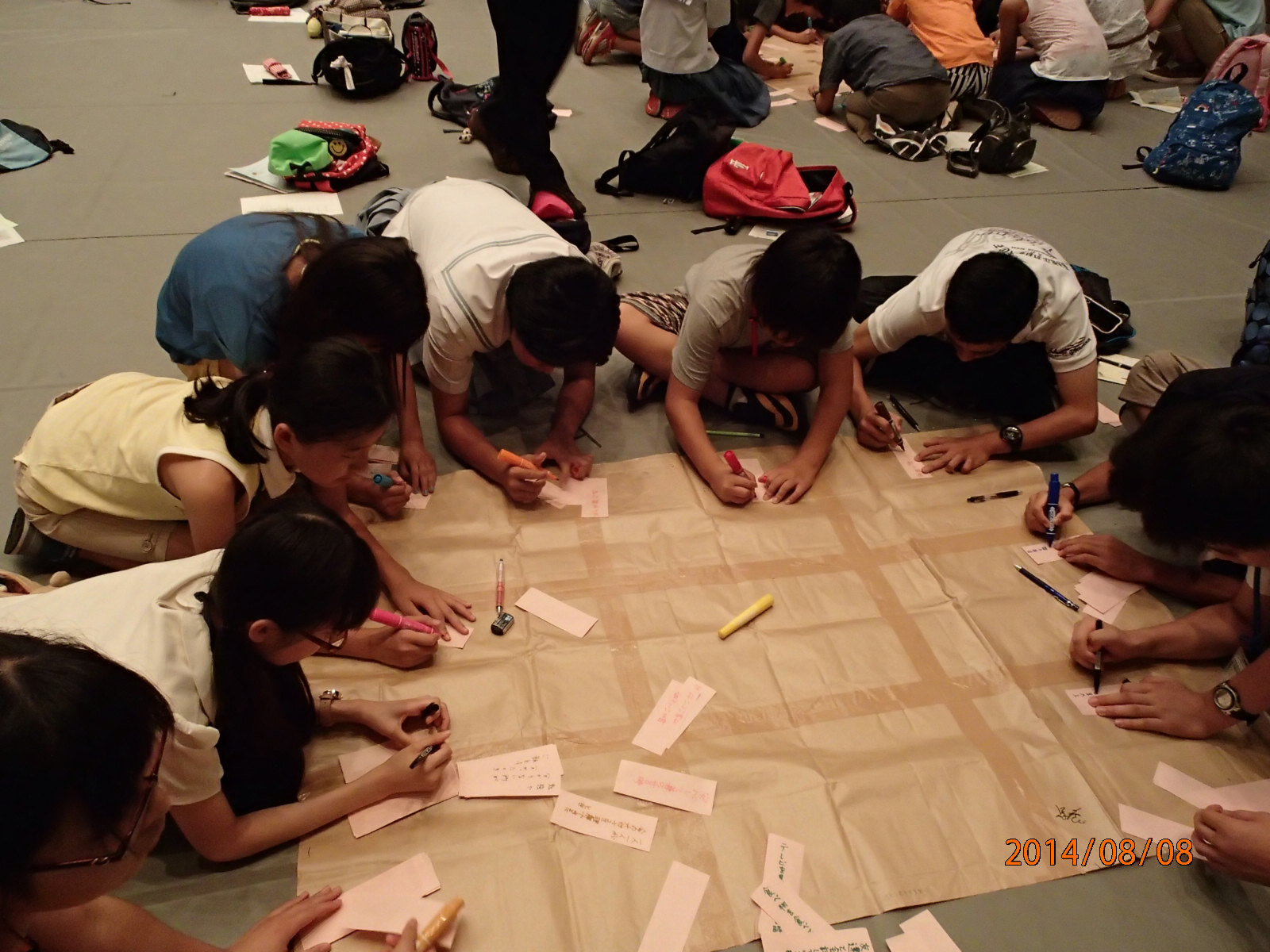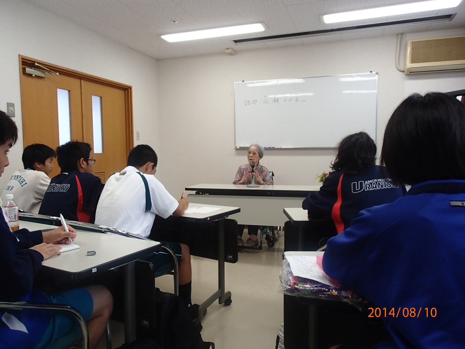疎開体験者講話では、第二次世界対戦時に浦添市から日向市へ学童疎開した方々を講師として招き、当時の疎開体験のお話を通して平和について意見交換しました。両市の団員それぞれ3グループに分かれて、質問形式により学童疎開体験者から当時の話を聞きました。その後、聞き取りした内容をグループでまとめ、それぞれ発表しました。