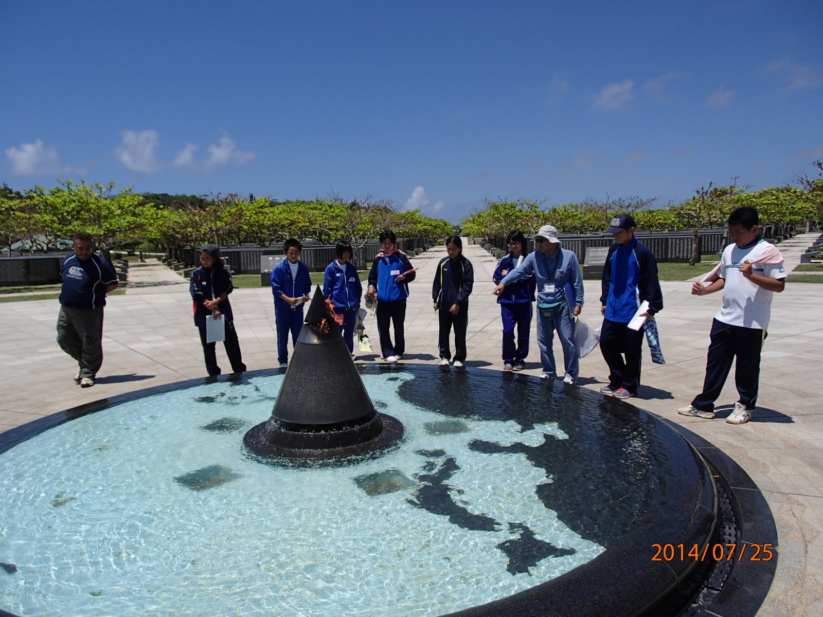 ▲平和の礎では、多くの戦没者が刻銘されていました。 ▲平和の象徴「平和の火」について説明を受ける団員。
