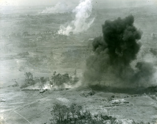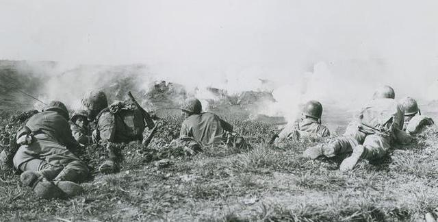 砲煙弾雨に煙る中部戦線。激しく抵抗する日本陣地に火災放射弾を浴びせる米軍。