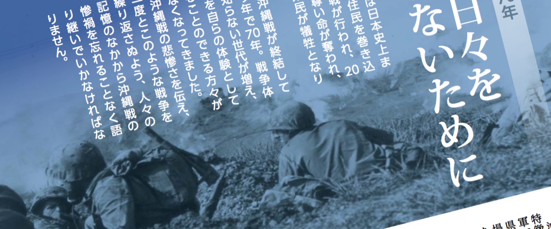 今年は終戦から70年目の節目の年です。沖縄戦では日本史上まれにみる、住民を巻き込んだ地上戦が行われ、20万人もの尊い命が奪われ、多くの県民が犠牲となりました。その沖縄戦が終結してから今年で70年。戦争体験を知らない世代が増え、戦争を自らの体験として語ることのできる方々が少なくなってきました。沖縄戦の悲惨さを伝え、二度とこのような戦争を繰り返さぬよう、人々の記憶のなかから沖縄戦の惨禍を忘れることなく語り継いでいかなければなりません。