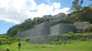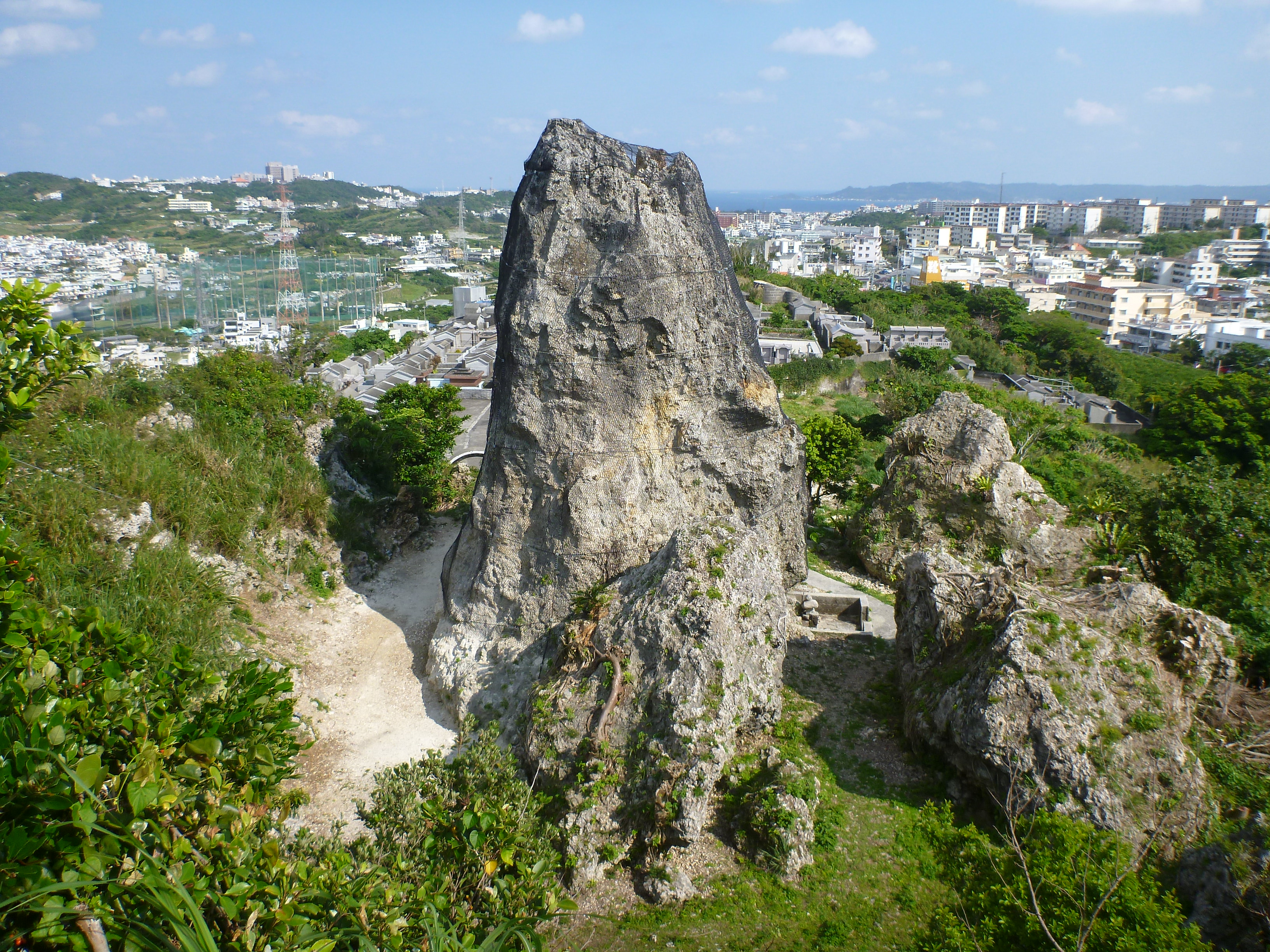 13 世紀末に造られたグスクで、中山(沖縄本島中部)を勢力下におく支配者の拠点と考えられています。14 世紀後半~15 世紀前半には最盛期を向え周辺には、王陵、寺院、池、屋敷、集落などを備え、後の王都・首里の原型と考えられています。政権拠点が首里城に移った後の16 世紀には第二尚氏第3代尚真王(しょうしんおう)の長男・尚維衡(しょういこう)が住み、それ以降は彼の子孫が屋敷を構えていましたが、1609 年の薩摩侵入の際に焼け落ちてしまいました。1945 年(昭和20)の沖縄戦ではグスクのある丘陵は前田高地(米軍にはハクソーリッジ)と呼ばれ日本軍の主要陣地となったことから激戦地となりました。沖縄戦や戦後の採石で城壁は失われましたが、現在復元整備を実施中です。