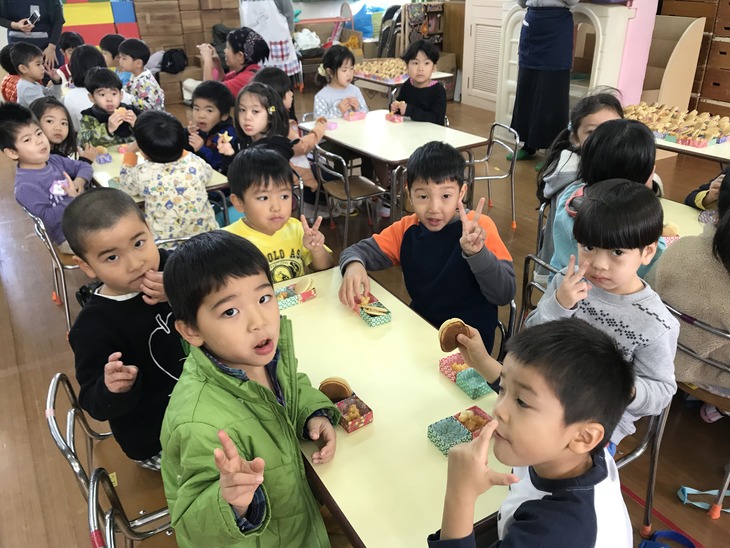 1月12日(金)保護者の方がボランティアで手作りおやつを作ってくれました!かわいい折り紙を使った手作りお皿のなかに、5種類の味のおかき、どら焼きが入っていてとっても美味しかったです♪