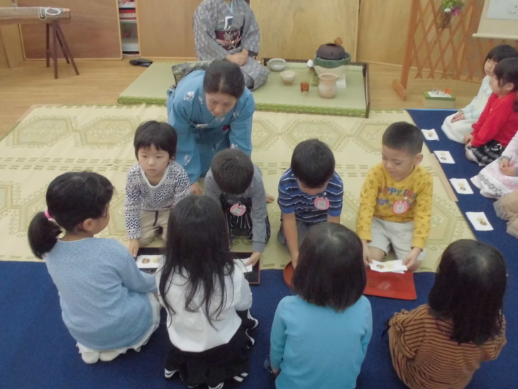 1月22日(月)にお茶会がありました。野原順子先生、他2人の先生が沢岻幼稚園の子ども達のためにお茶会を開いてくれました。正座をして抹茶を飲んだり、お茶を配る役をしたりと、とても良い経験になったと思います!