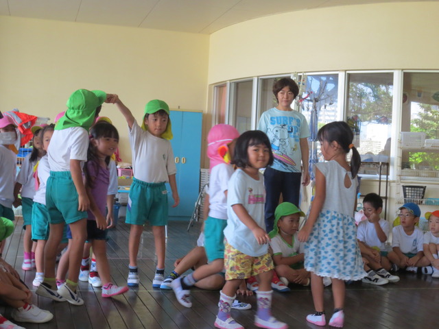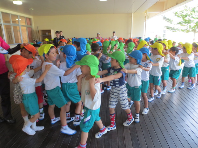 浦城幼稚園では、月に1度のわくわく集会があります☆わくわく集会という名目でリズム体操や運動遊び、集団遊び等を園全体で取り入れています♪運動会でもやるラジオ体操から始まり、じゃんけん列車、かけっこをしました。じゃんけん列車では、「じゃんけんぽんっ!」「わぁ~こんなに長くなってる!」等の声が聞こえてきました!また、かけっこでは、まっすぐゴールまで走ることを目標に頑張って走っていましたよ!かけっこの途中で転んだ子もいましたが、最後まで諦めずに走りきることができました。えらいぞ~!