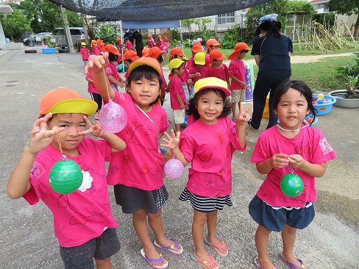 ヨーヨー釣りで釣れたヨーヨーを大切にする子どもたち・・