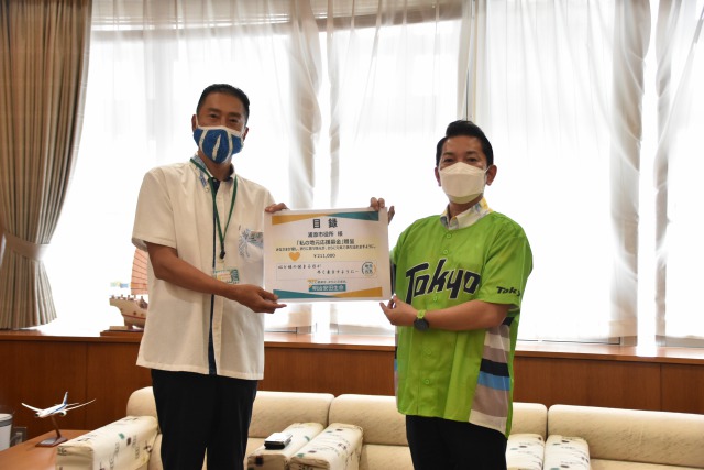 令和3年10月1日金曜日 浦添市役所市長応接室にて、明治安田生命保険相互会社様より、浦添市ふるさとてだこの都市応援寄附金の目録贈呈が執り行われました。