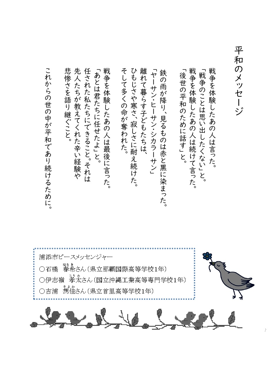 毎年、浦添市ピースメッセンジャーは追悼式に参加し、「平和のメッセージ」を朗読しています。今年は追悼式の規模縮小に伴い、令和元年度に、中学生平和交流団として「平和の尊さ」について学び、学童疎開地である宮崎県での交流学習や研修に参加した経験をもつ浦添市ピースメッセンジャー(現在高校1年生)の3人が、戦火に倒れた多くの命への思いと平和への決意「平和のメッセージ」を録音でお届けしました。