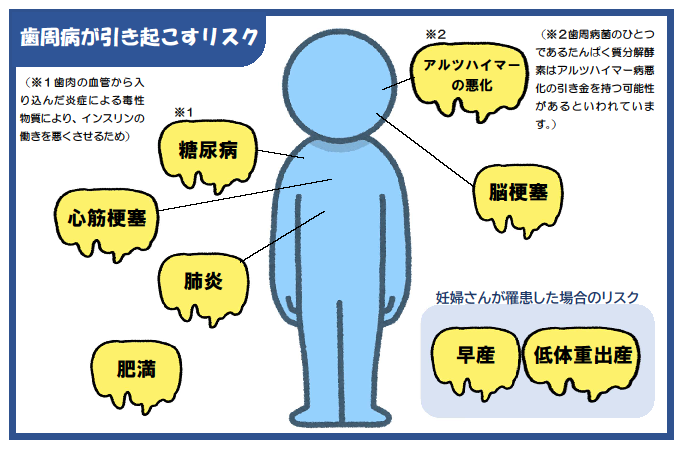歯周病とは、口腔内に発生した細菌による炎症で、歯の周りの歯茎(歯肉)や歯を支える骨などが溶ける病気です。また、口腔内だけの病気ではなく細菌が血液・呼吸器内に入り込み”心筋梗塞”や”動脈硬化”、”肺炎”や妊婦さんの場合早産にも繋がる恐れもあります。歯周病はとても身近で恐い病気なのです。