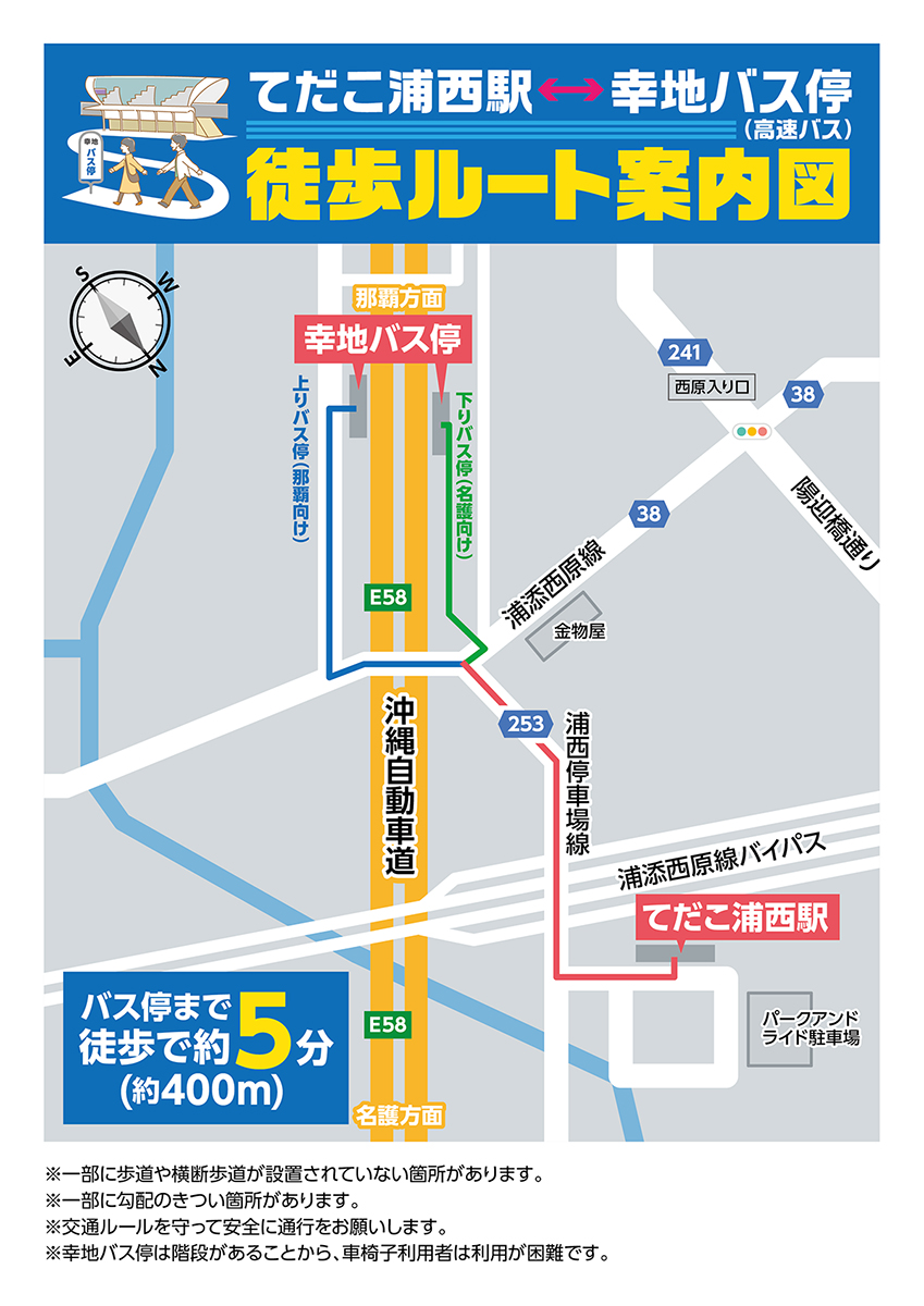 モノレール(てだこ浦西駅)と高速バス停(幸地バス停)を乗り継ぎ利用される方のために、徒歩ルート案内図を作成しました。