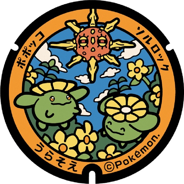 浦添市のポケふたは、てだこの都市のシンボルである太陽☀をイメージさせる「ソルロック」と、市花オオバナアリアケカズラ🌼と同じ花の色の「ポポッコ」というポケモンが描かれています!