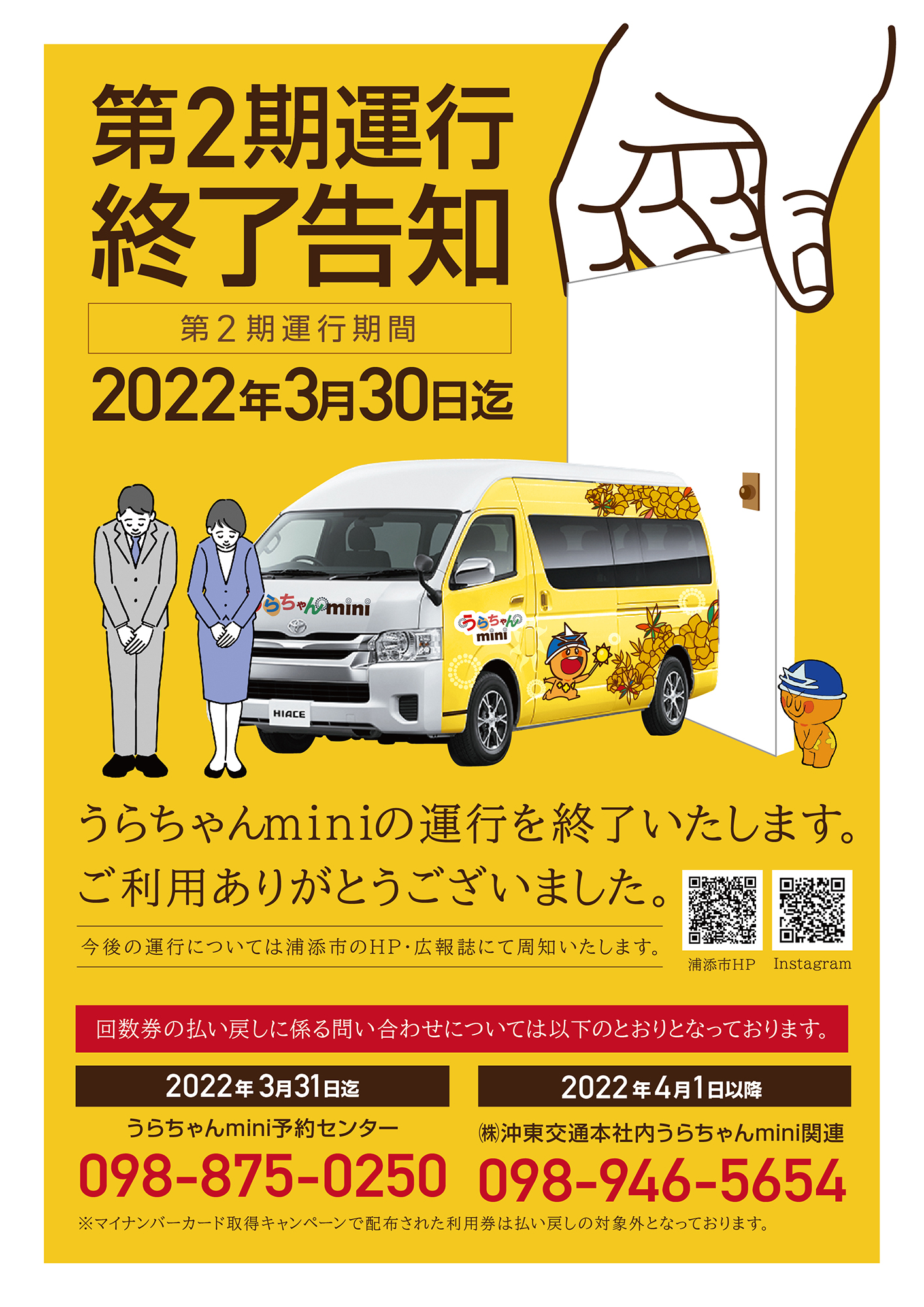 うらちゃんminiは2022年3月30日を持ちまして第2期運行を終了いたします。たくさんのご利用ありがとうございました。