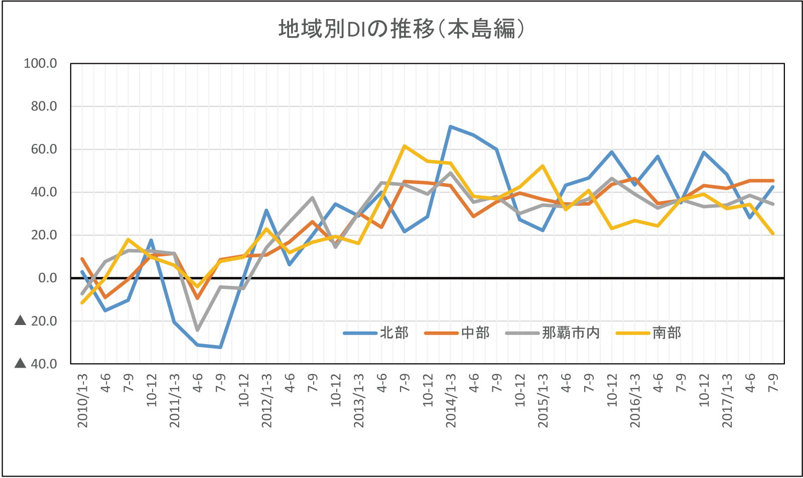 地域別にみると、直近では本島全域においてプラスで推移していることがわかります。各地域で建設需要や観光関連需要の増加により企業での受注(引き合い)が増えたことなどが背景となっています。