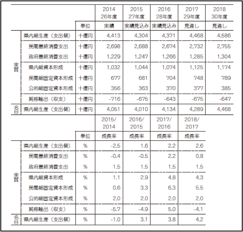 これらの状況をみると、実質県内総生産は2017(平成29)年度は2.2%の成長が見込まれ、2018(平成30)年度は2.6%の成長となる見通しと予測されます。