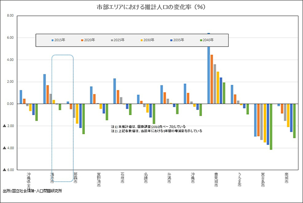 県内における市部エリアの人口は、全体の約7~8割を占めるボリュームゾーンとなっています。 2040年までの将来像を国立社会保障・人口問題研究所の公表データを用いてみてみましょう。 2010年の国勢調査をベースにすると、県全体の人口は2020年頃まで増加し、その後に減少に転じるようです。 そのような中、浦添市の人口をみると2030年頃まで増加すると予想されており、県内市部エリアにおいて人口増加の続くエリアのひとつとなっています。