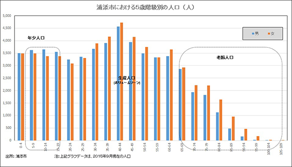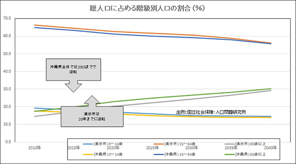 続いて、総人口に占める各階級の割合をみると、トレンドとしては沖縄県全体と同様に推移していくことがわかります。 内訳では生産年齢(15~64歳)の割合が低下傾向にあり、年少人口(0~14歳)と老齢人口(65歳以上)の割合が逆転していくことがみてとれます。 これらは、徐々にマーケットのボリュームゾーンにおける老齢人口のウェイトが高くなり、消費行動などのあらゆる面に影響を及ぼすことが予想されます。 ちなみに、浦添市においては、逆転するタイミングが県全体のそれより若干遅く2020年頃になるようです。
