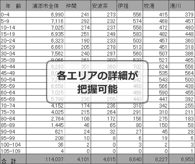 人口動態データをグラフ化してみると、浦添市全体のみならず市内集落における個性がみえてきます。たとえば、「ワカモノが多い(多く住む)エリアはどこなのか」、はたまた「働き盛りの方々はどのエリアに多く居るのか?」、もしくは「シニア層は・・・?」などと、商圏分析を行なう場合に各集落の個性を読み解くことができます。さらに、別途で周辺の交通利便性、教育機関(学校関係)や介護施設などの事業所データなどと併せてみることで、各エリアの個性を深く把握することもできます。