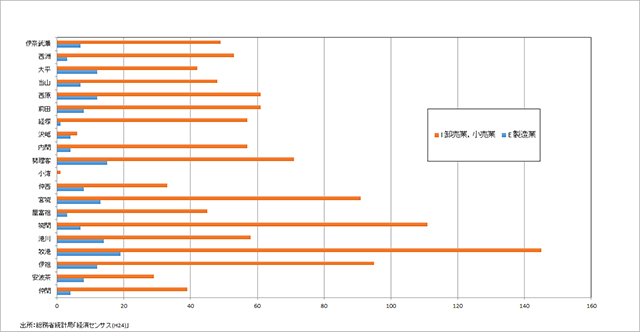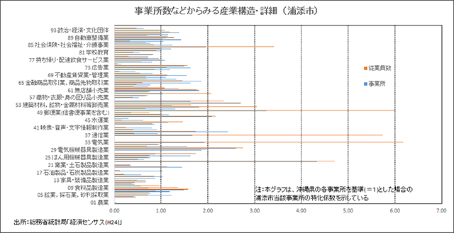 さらに細かいデータをみると、事業所数ベースでは、非鉄金属や情報通信機械器具などを含む「製造業」、各種卸売などを含む「商業(卸売業・小売業)」、情報サービス業を含む「情報通信業」などに特化し、従業員数ベースでは、電気業を含む「電気・ガスなど業」や各種卸売などを含む「商業(卸売業・小売業)」などに特化していることがわかります。