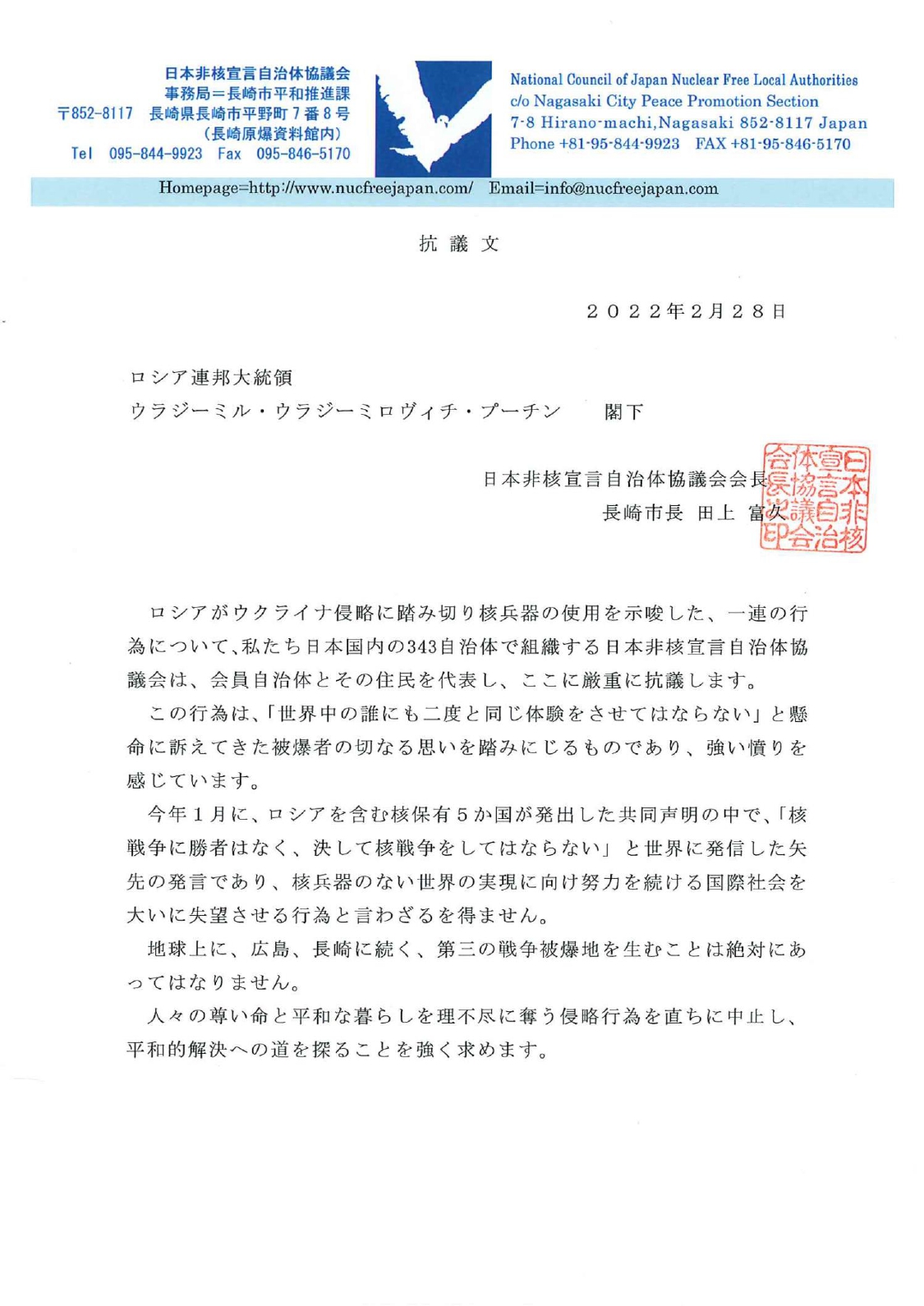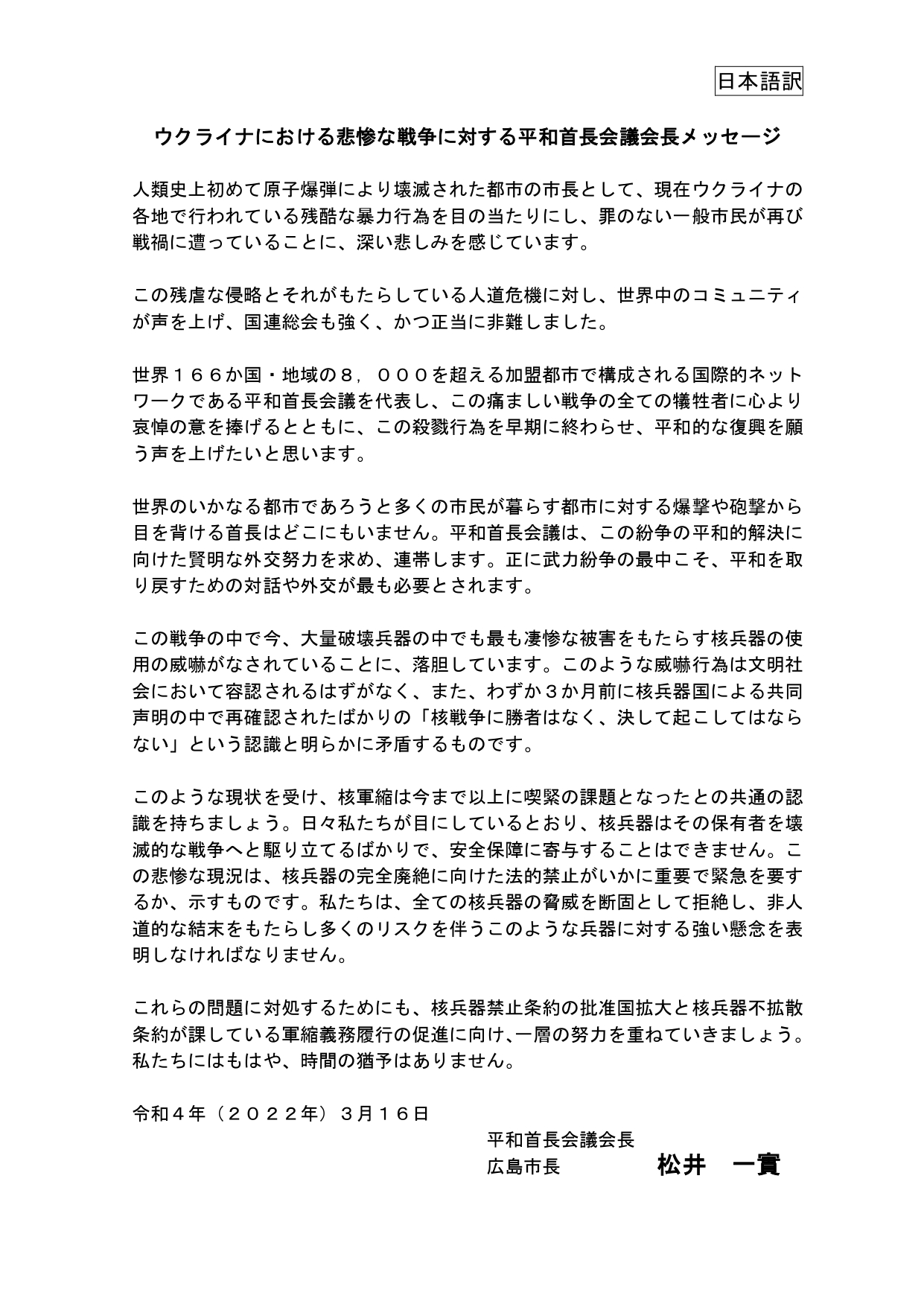 ■ウクライナにおける悲惨な戦争に対する平和首長会議会長メッセージ ■【大使館あて】ロシア核兵器使用示唆に対する抗議文