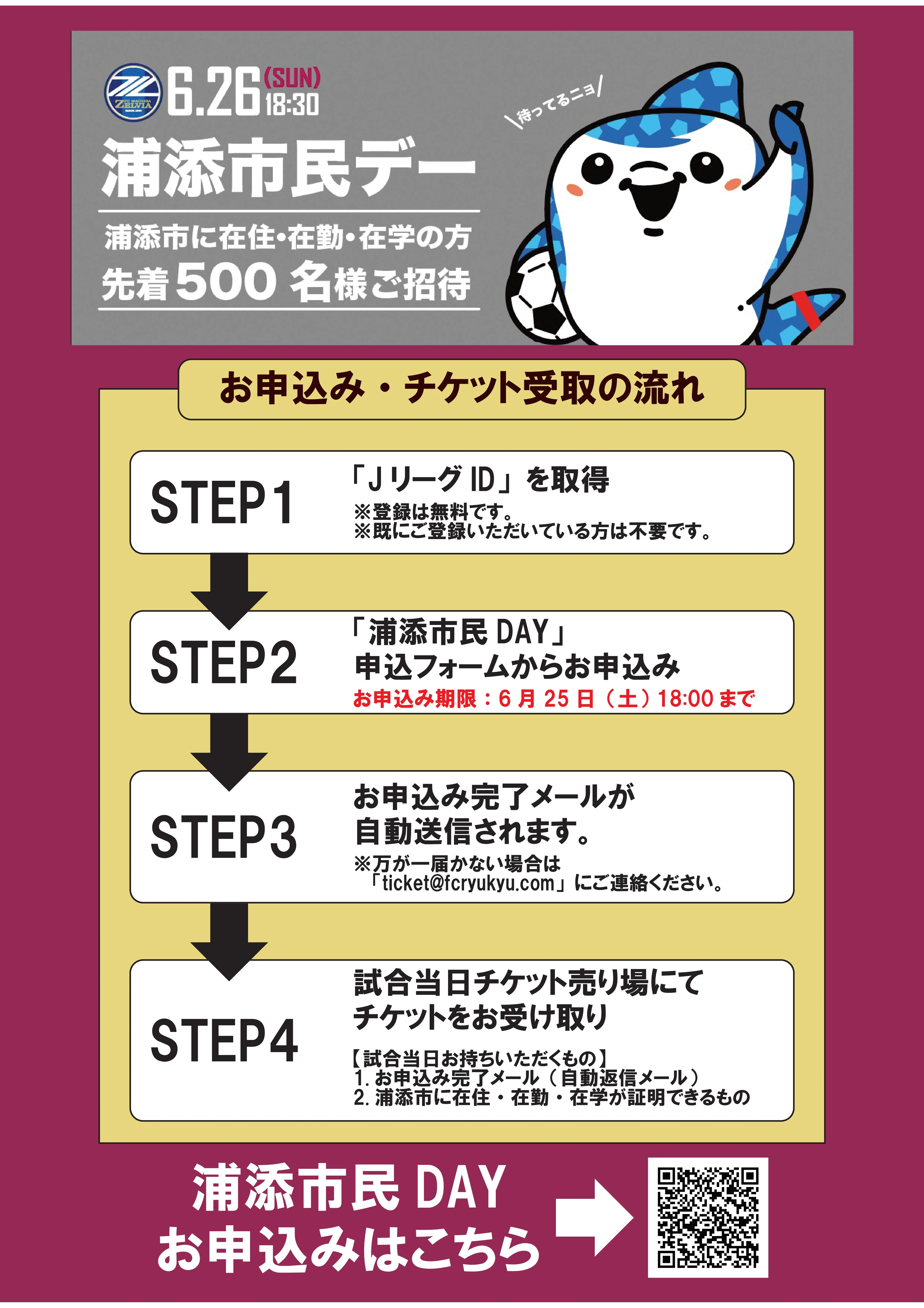 ・お申込みの前にお申込みのJリーグIDで「FC琉球がお気に入りクラブに登録されているか」、「@fcryukyu.com」からメールを受信できるように設定ができているかの2点を必ずご確認お願いいたします。