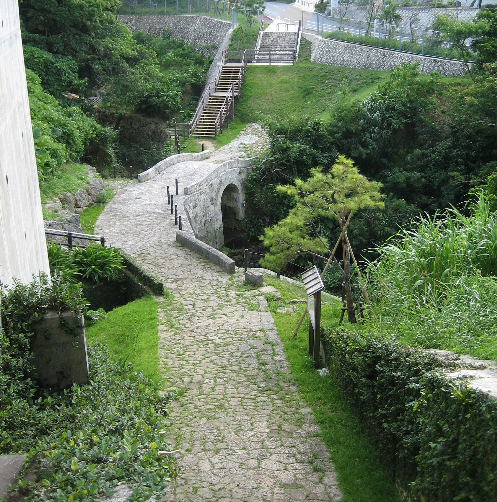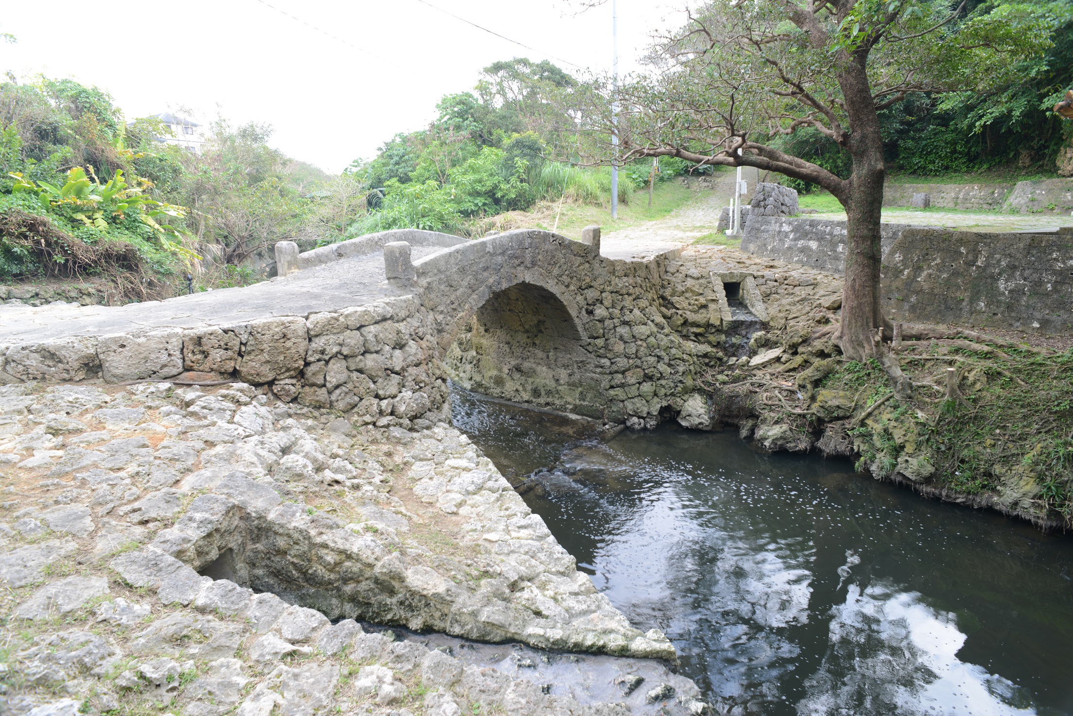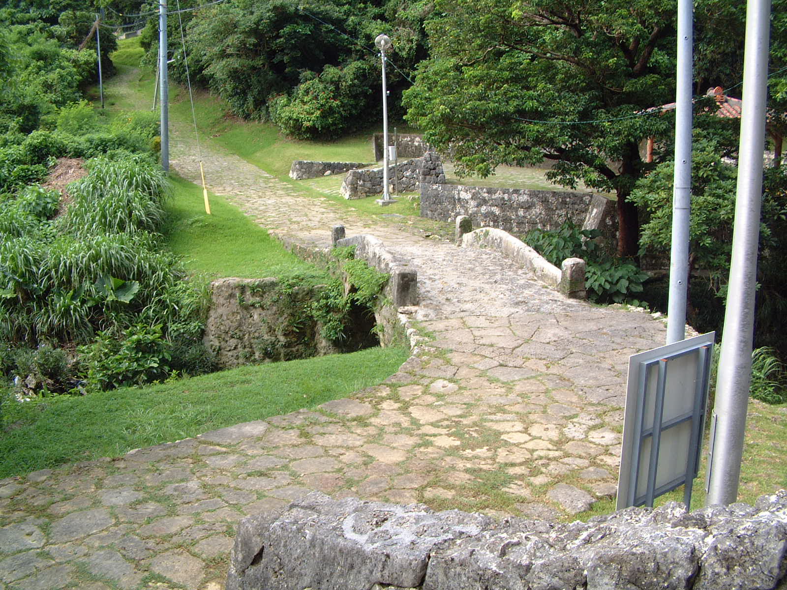 この辺りの道は馬が転ぶ程の坂道なことから「ウマドゥーケラシ」(馬転ばし)と呼ばれていました。石畳道の途中、牧港川には当山橋と呼ばれる大正から昭和に改築された石橋が架けられています。