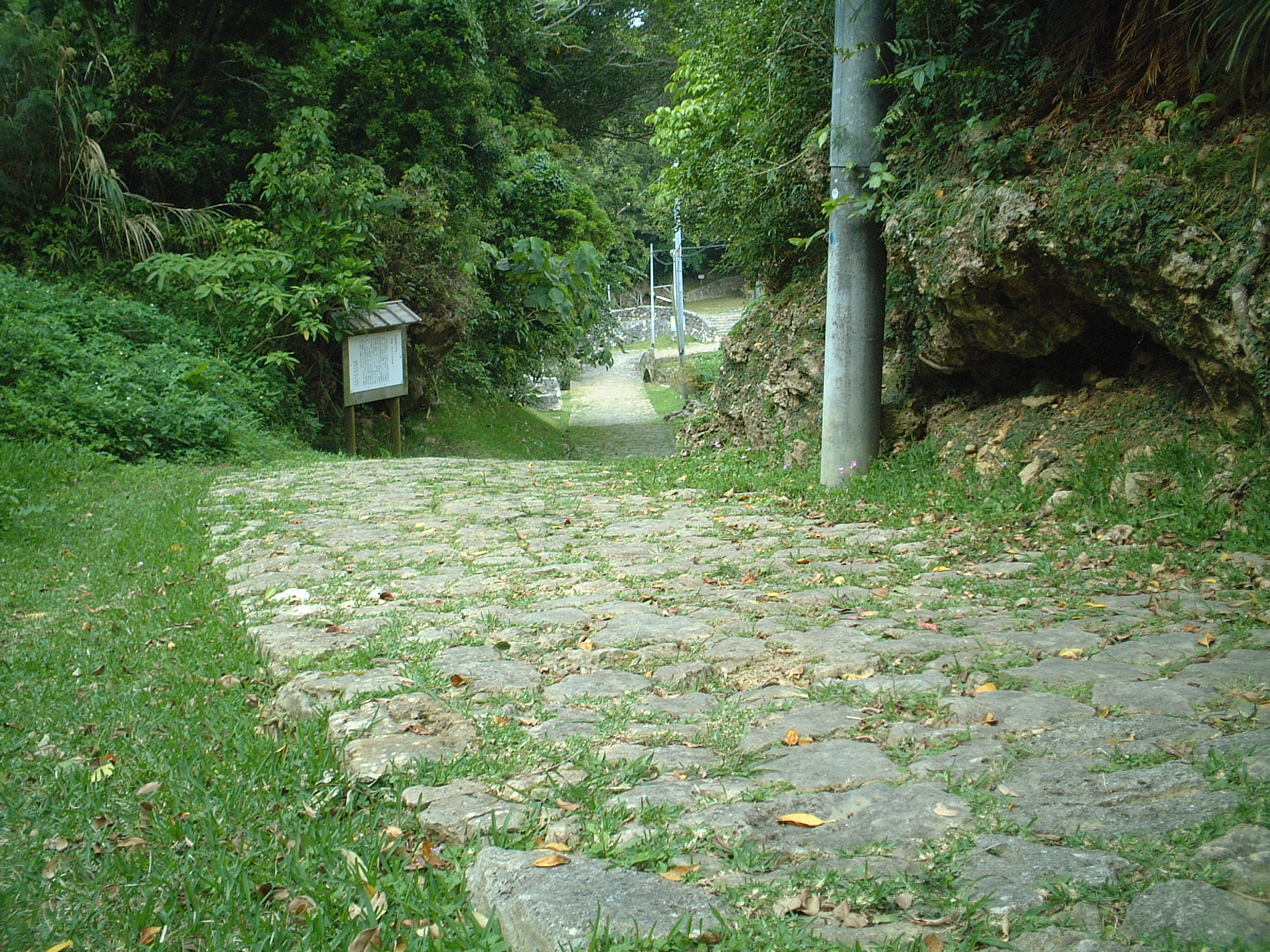 普天満参詣道は中頭西海道から分かれて普天満宮へ向かう道です。1644年に尚賢王の普天満参詣が始まるので、この頃にはこの道が存在していたと考えられています。当山川の南北に敷かれた保存状態が良好な約210mの石畳道を普天満参詣道と称し、地元では「当山の石畳道」の名称で親しまれています。