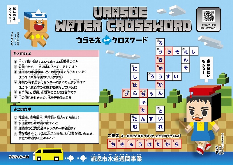 本市では、啓発活動の一つとして、水に関する学習を行う市内小学校4年生に対し水道の理解を深める事を目的に、「うらそえ みず クロスワード」下敷きの配布を行いました。